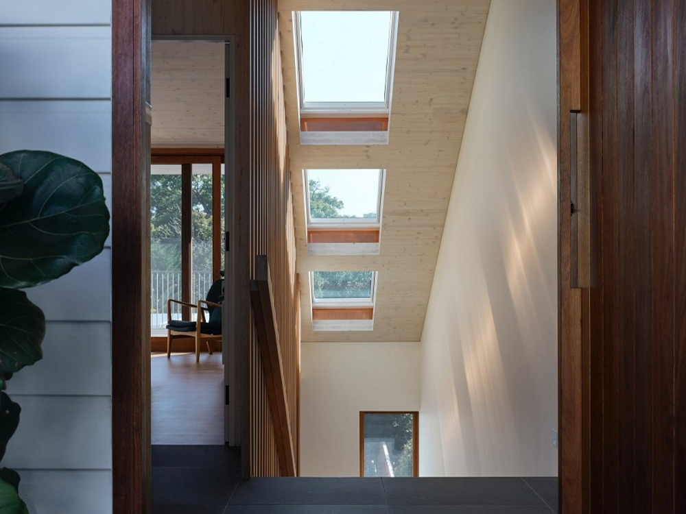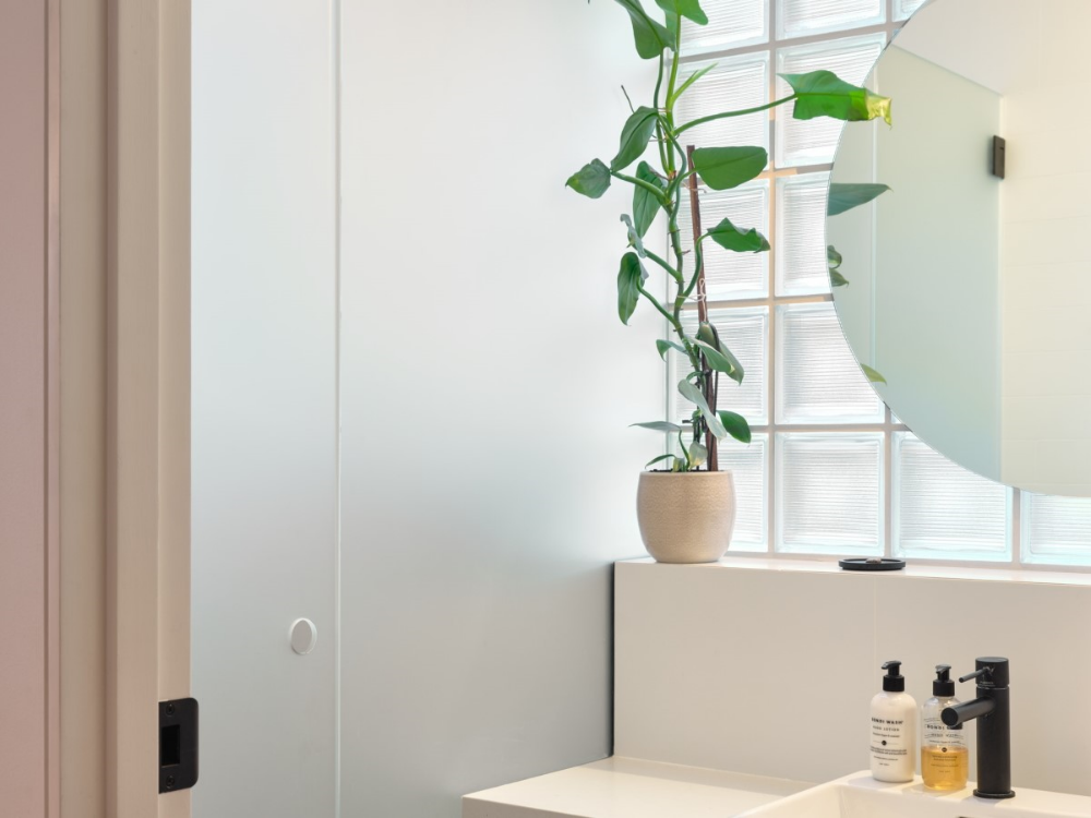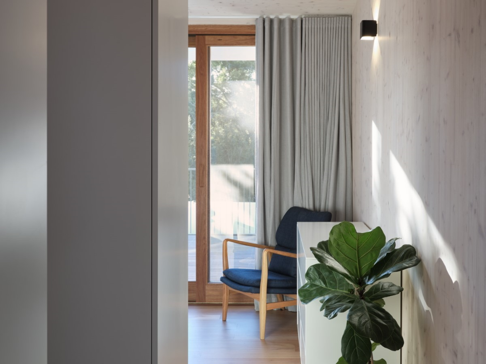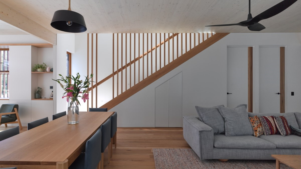 An upper-floor extension hosts the entry, main bedroom, ensuite, and robe. This extension was constructed from Cross Laminated Timber (CLT) which was central to the sustainability strategy as CLT provides a structural system that does not require secondary internal cladding. This efficient use of materials is part of the de-materialised design philosophy which seeks to eliminate waste and celebrate materials in their raw form. All of the new building fabric including structure, cladding, and linings were selected to be carbon negative. The combination of maximising re-use, thoughtful specification of new materials, double glazed windows, insulation, and the inclusion of solar panels, and rainwater tanks results in a beautiful and environmentally friendly family home.