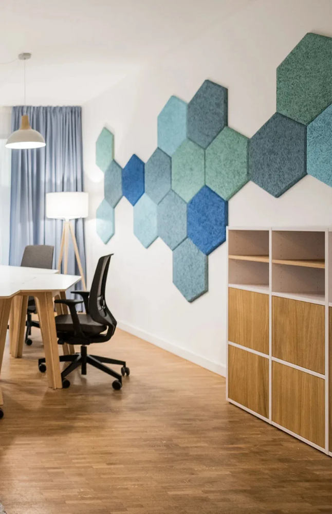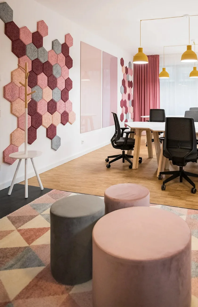Maria Guenther, co-founder and creative managing director, explains: 'The BAUX acoustic products contributed a lot to this project as they come in a great variety of shapes and colours. For example, the wood wool hexagon tiles in small and large fit perfectly to the Scandinavian interior design style. Combining different colour tones we created a wall graphic, which was both a stylistic element and a practical acoustic absorber. The bigger wood wool panels in black and grey were arranged in a linear way and used for the rougher industrial style. With acoustic products from BAUX we were able to round off our design concepts with unique and functional wall decorations'.