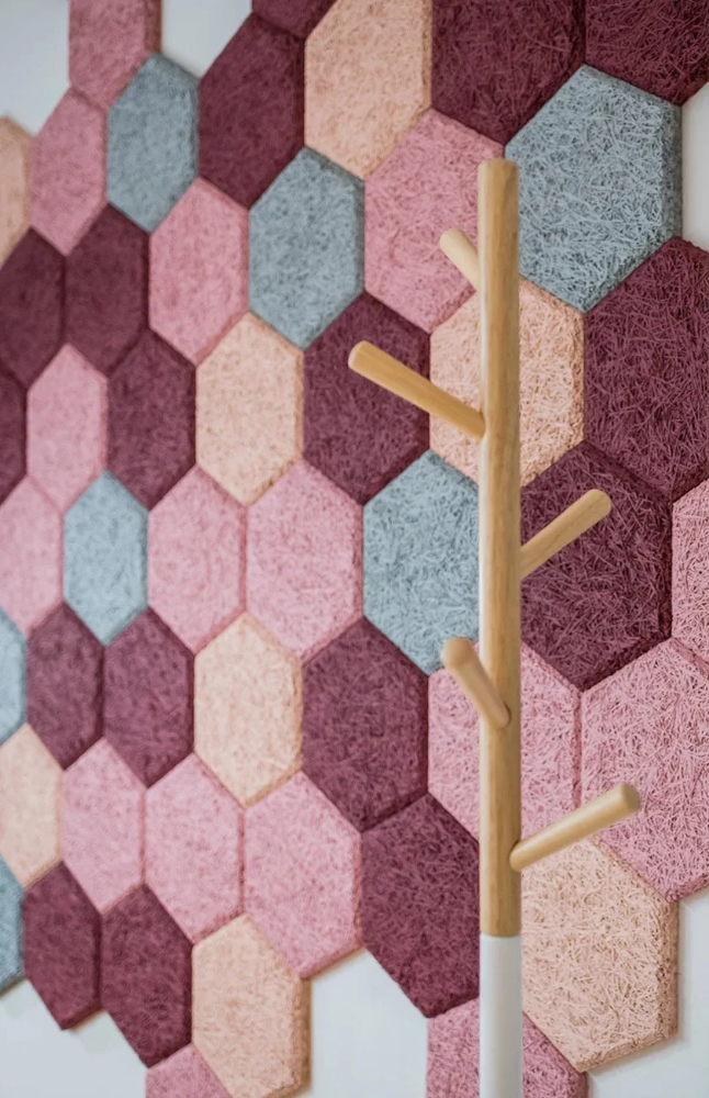 Base 1, measuring over 100 sqm, combines floral and geometric influences. BAUX Small Hexagons in shades of pink and purple line the walls in an elegant honeycomb pattern. Base 2, by contrast, makes use of BAUX Large Hexagons in cool shades of blue, grey and green for a more aquatic feel. Base 3 is tonally sombre, with BAUX Panels in grey and black dominating the walls. Bases 4 and 5 share a similar design. For this project, BAUX products served dual purposes: both as an acoustic solution and as a visual graphic. Each colour, shape and pattern was carefully picked according the particular look and feel of each room.