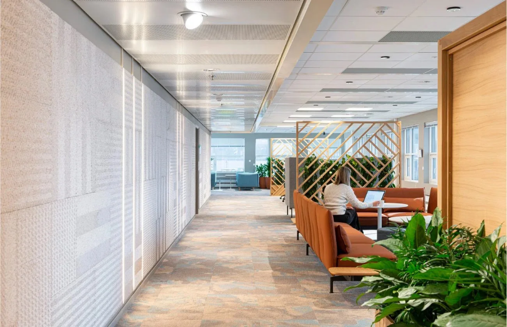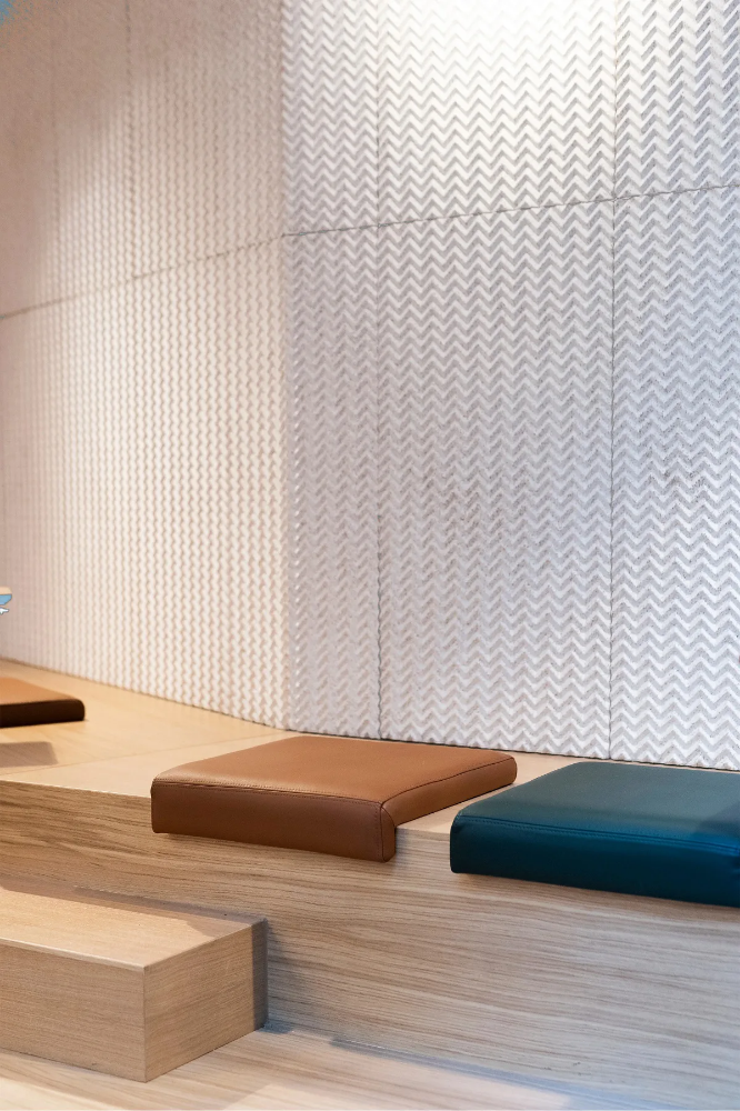 As building a sustainable workplace was a crucial part of Fremtind’s values and vision, Zinc’s interior architects chose to use BAUX Acoustic Pulp, our most sustainable product to date, with beguiling effect. The natural textures and tones blend seamlessly with the building to create a modern functional space with hints of natural beauty. Pulp’s 100% bio-based, biodegradable footprint fits perfectly with Fremtind’s vision of lifelong sustainability.