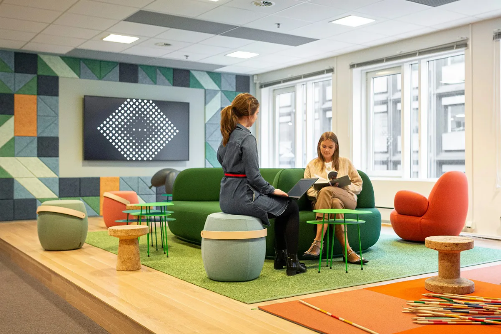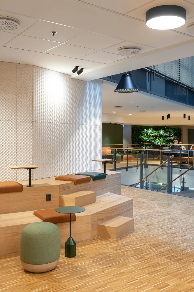 Fremtind’s interior concept is: insurance for life and interior architect Therese Haaland Jonassen explained that each floor in the building represents a different phase in life. The entrance is designed to allow workers to have quick spontaneous meetings with clients, without having to sign them into the building. The canteen on the second floor is a vibrant hub for multi-function interaction and the top floor, with views over Oslo, is a creative space for conversation, contemplation and reflection.