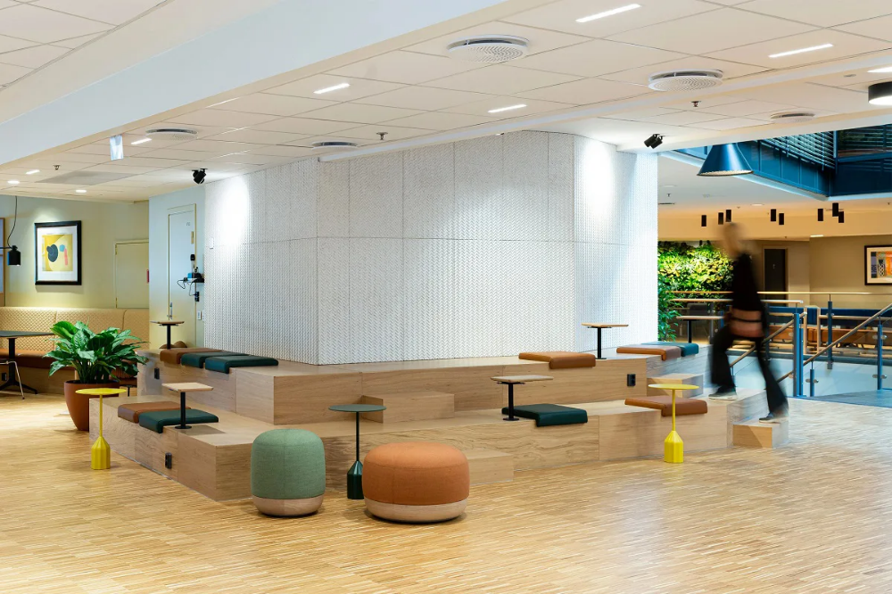 As part of the renovation of the existing building, Fremtind adopted a new activity based method of working. Throughout the building there are many open areas, which makes work easy and transparent. In these types of open spaces however, clusters of conversation can create background noise, which can easily distract workers. To reduce sound reflections, BAUX Pulp has been used extensively in common areas and meeting spaces. As well as being 100% sustainable, BAUX Pulp effectively absorbs sound reflections in the human voice spectrum, to create a beautifully harmonious workspace.