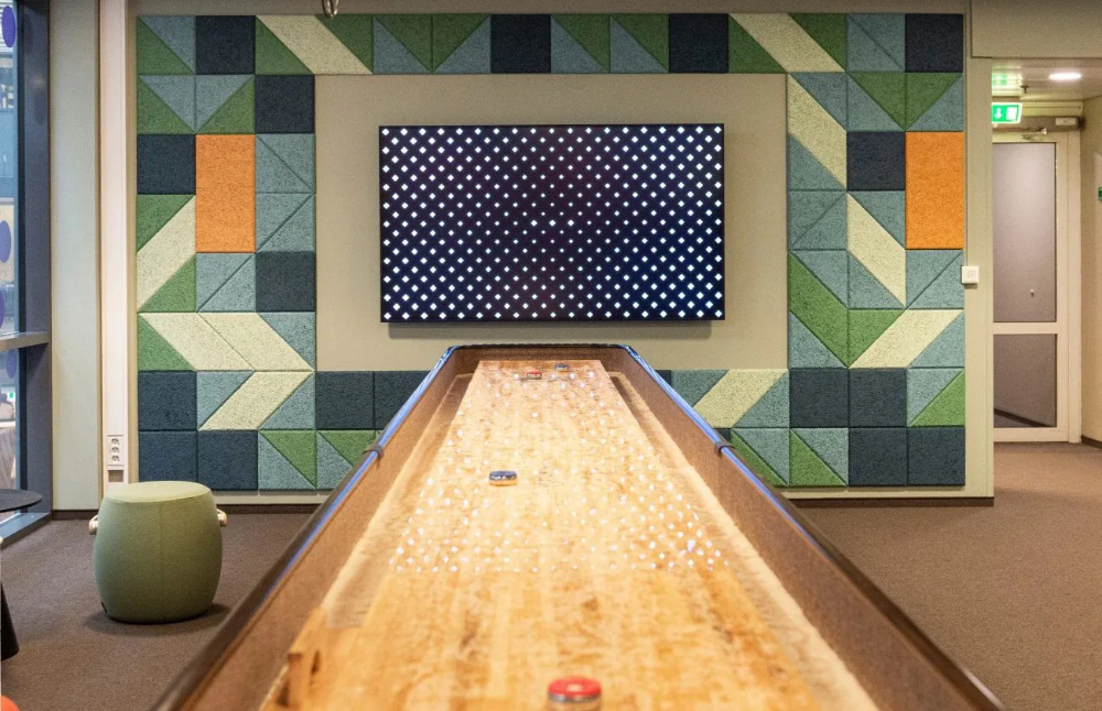 Throughout the building, BAUX products have been used to create optimal acoustics and a unique visual identity for each floor of the building. In some spaces, colourful BAUX designs radiate creative energy whilst in others, muted murals create a subtle backdrop for focused conversation. In walk through passages, spotlights have been placed as eye catching intersections between BAUX tiles. Aesthetically the building is modern, welcoming and professional.