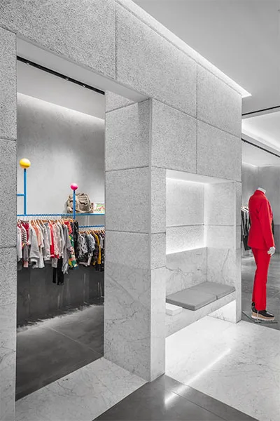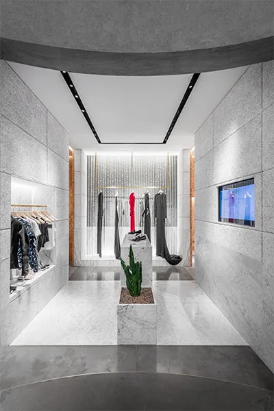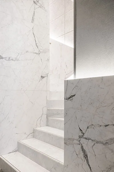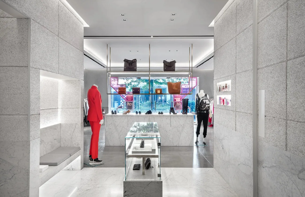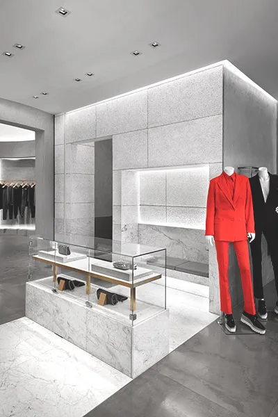 Stella McCartney’s stores are a visible commitment to her respect for nature and her passion for sustainably sourced materials. Like BAUX, Stella believes that modern design should be beautiful and sustainable. The Milan store is located in a stunning 18th-century neoclassical building with integrated Calacatta marble running through the ground floor and staircase. Large white rectangular BAUX tiles and linear brass and steel walls rails create an exquisite milieu for Stella’s signature designs.