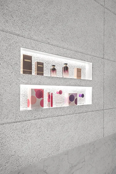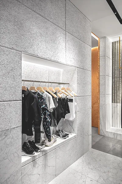 Stella McCartney was one of BAUX’s very first customers and like many since; she was attracted to the unique properties of wood wool tiles. 'The creative potential was something that the store designers at Stella McCartney were very quick to see. They asked for samples of all our tiles, in many different colours before settling on the large white rectangular tile', explains Fredrik. 'What started as one store has grown into global partnership, and we’re and very proud to be a part of their vision and journey'.