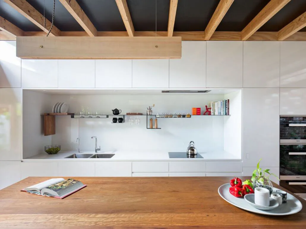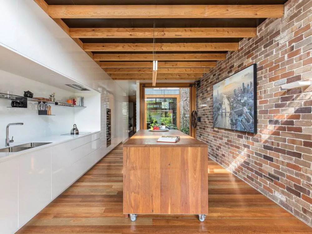 Essential services are aligned along the party wall and the cabinetry finish subtly increases the ambient light, contrasting warmer brick and timber tones. A custom, folded steel shelf houses a collection of everyday objects and products the owner’s delight in.