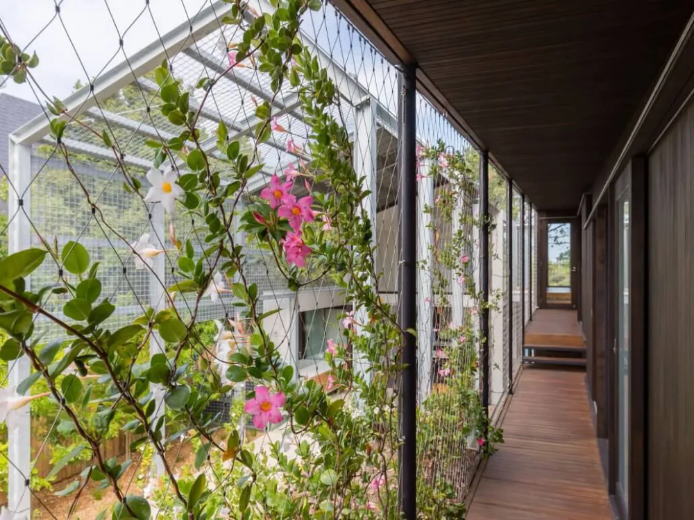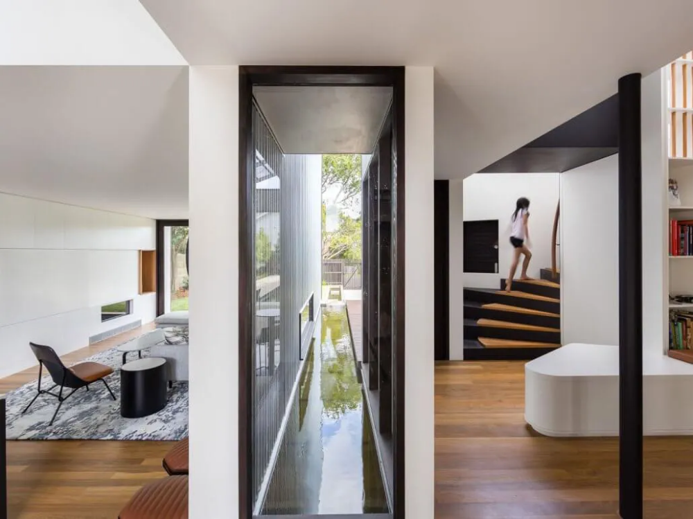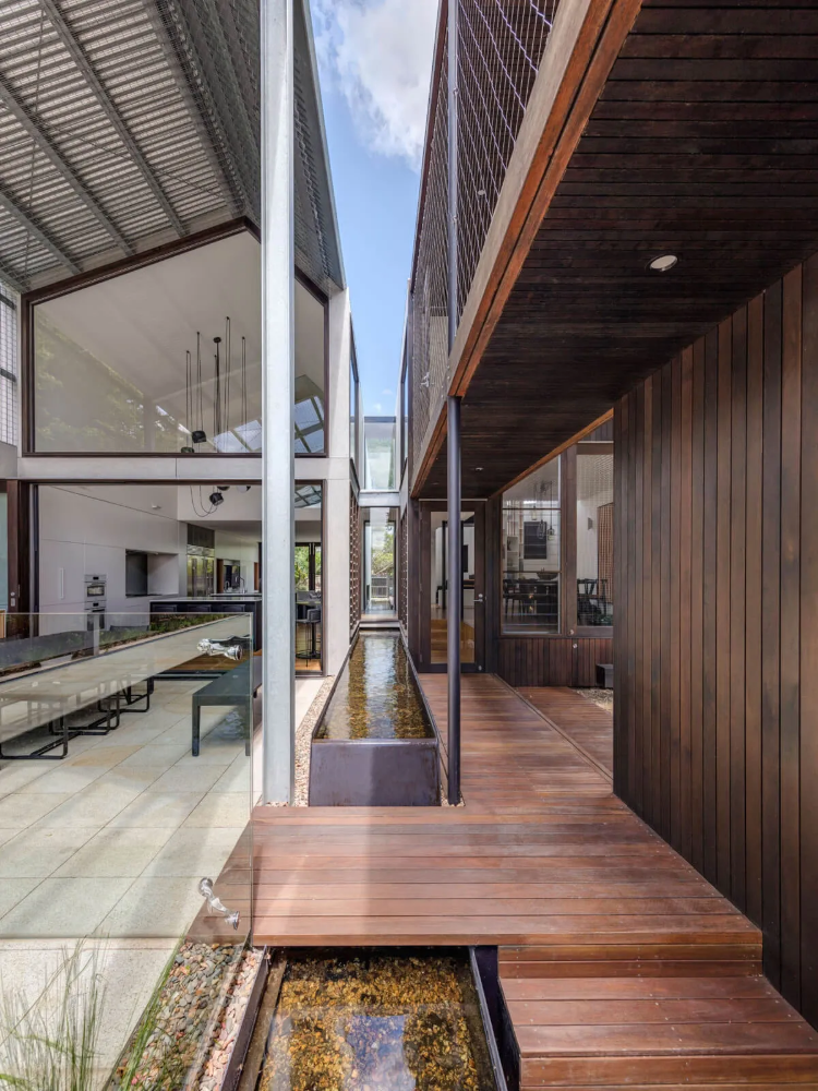 The design delivers generous living and entertaining areas which flow to outdoor areas at ground level, while an elevated external corridor connects the children’s bedrooms which have outlook onto green spaces and the swimming pool.