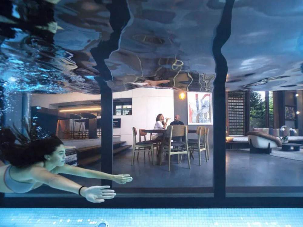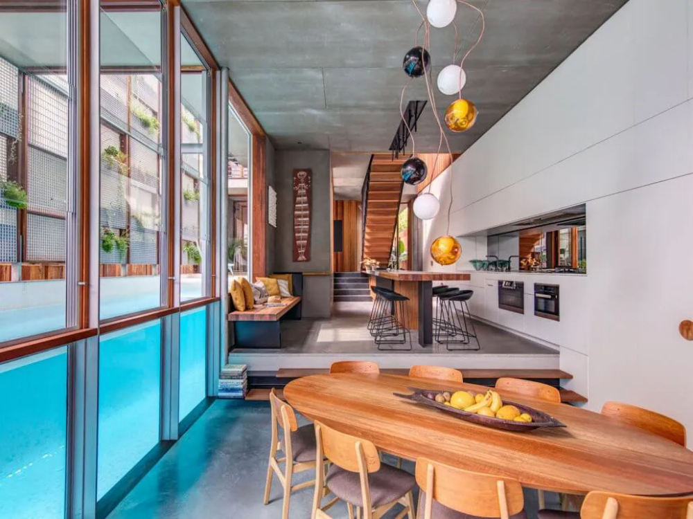 Downstairs, the interconnected kitchen, living, dining and outdoor spaces create highly interactive and engaged spaces designed to accommodate large groups easily. Smaller groups can retreat to the media room which overflows into the private entry courtyard. Secure storage for sports equipment is accessible from the entry, which makes it easy to grab a surfboard and head to the beach after work or school. A galley style kitchen and island bench include carefully considered lighting, while custom built-in seating provides guests somewhere to recline and converse. The pool shares a clear wall with the double height social space and acts as a visual connection between the interior and exterior spaces, refracting natural light throughout the lower level of the house.