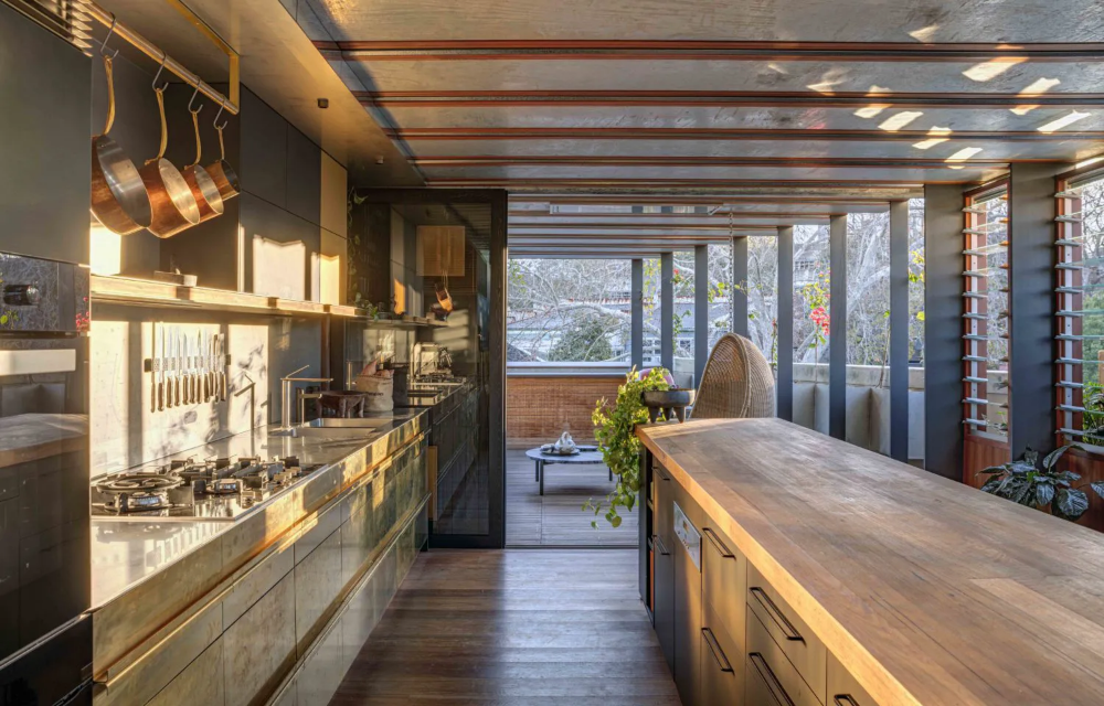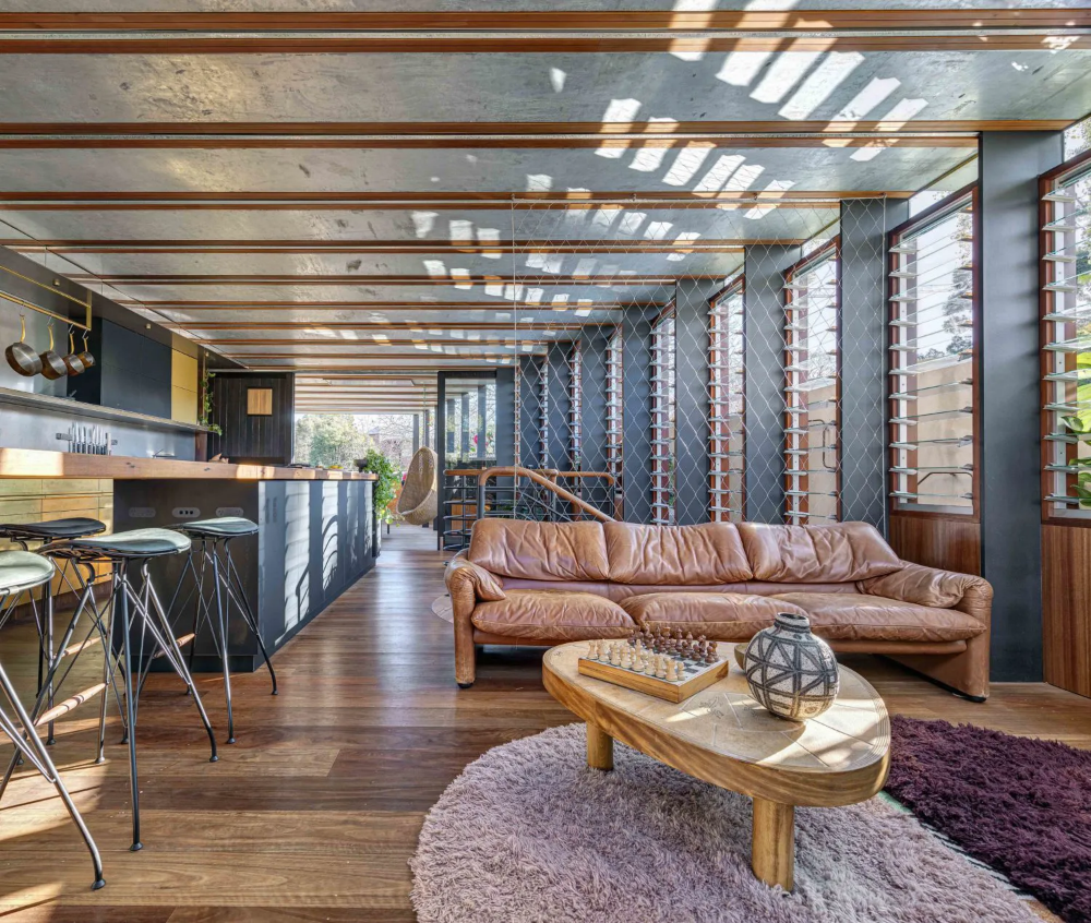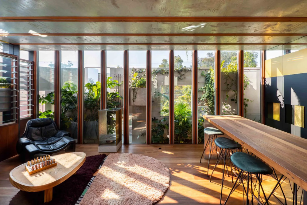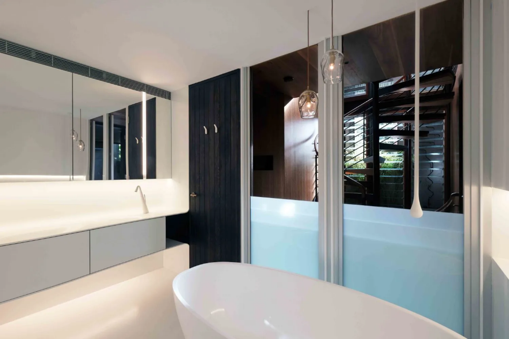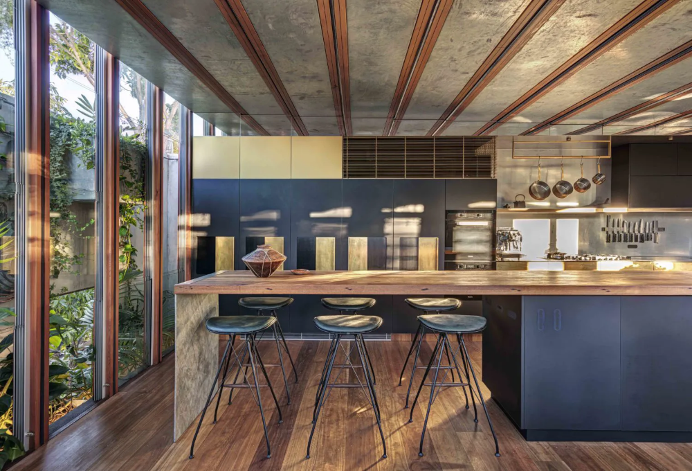 The fully operable glass inner skin of the home is inset from the outer punctuated masonry façade, providing an abundance of light and outlook whilst maintaining privacy from the public realm. This interstitial zone provides passive thermal regulation across the upper floors with planter beds ‘floating’ in between the glass and masonry skins to provide outlook to greenery and cooling to internal spaces via transpiration. The floating planter beds are also an integrated structurally engineered solution to the lateral bracing needs of the masonry wall.