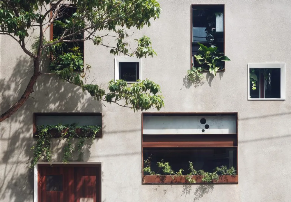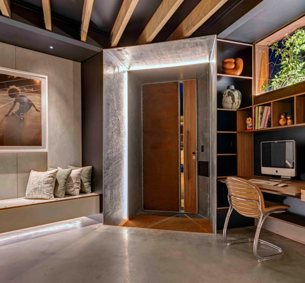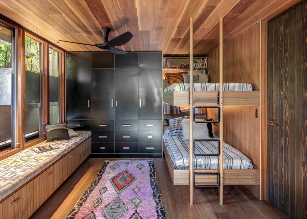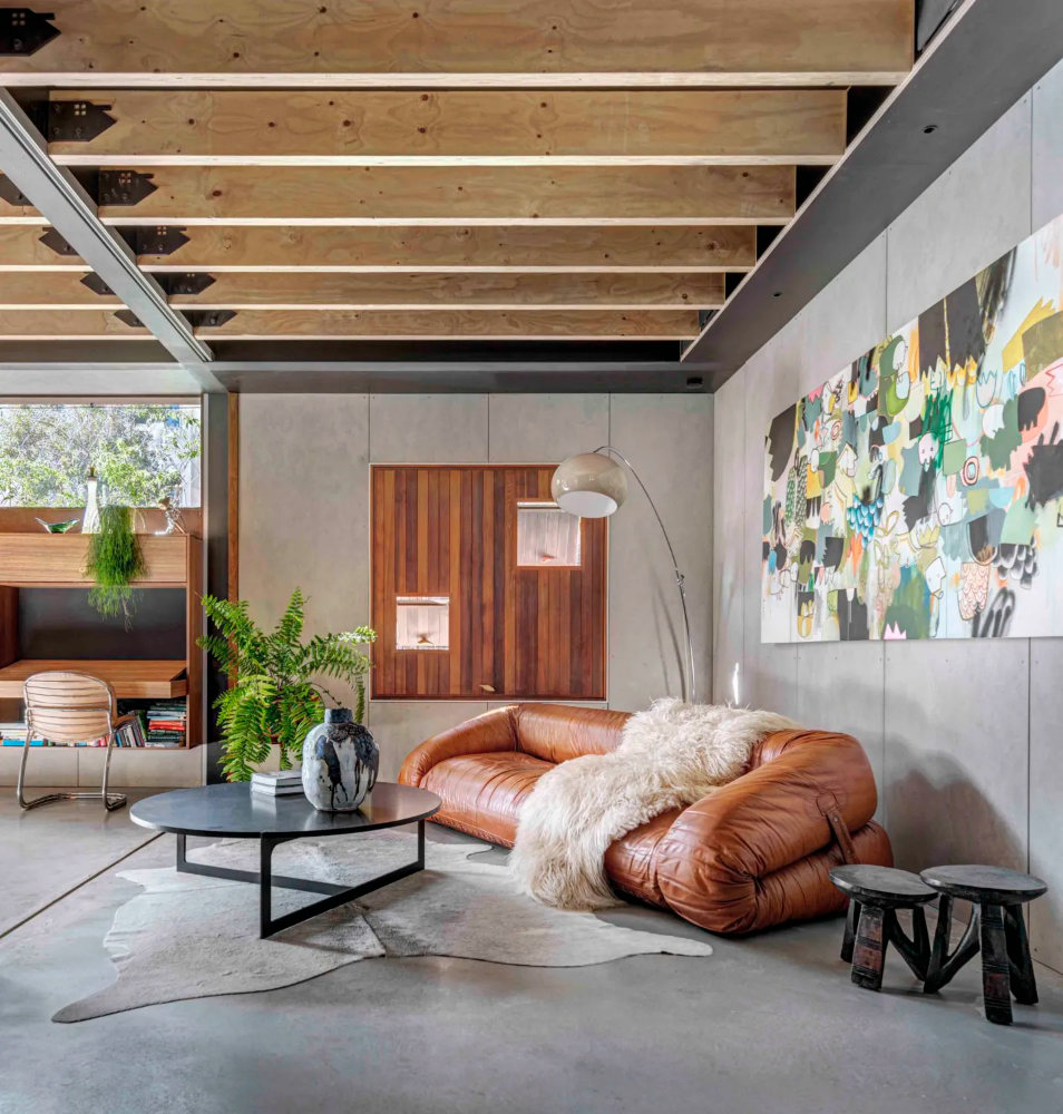 The fully operable glass inner skin of the home is inset from the outer punctuated masonry façade, providing an abundance of light and outlook whilst maintaining privacy from the public realm. This interstitial zone provides passive thermal regulation across the upper floors with planter beds ‘floating’ in between the glass and masonry skins to provide outlook to greenery and cooling to internal spaces via transpiration. The floating planter beds are also an integrated structurally engineered solution to the lateral bracing needs of the masonry wall.