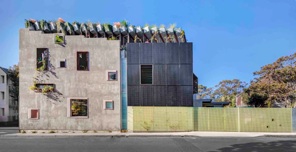Built within a rejuvenated heritage façade of rendered masonry, steel, timber and greenery, the Welcome to the Jungle House is situated in an inner-city heritage conservation area typified by late Victorian row terrace housing and post-industrial warehouse conversions. A two-storey shop top house in disrepair and close to collapse originally occupied the 90sqm triangular site. The original spackled rendered masonry façade had cultural and streetscape significance to the local heritage conservation area and its necessary reconstruction was managed under strict heritage controls. Original window openings have been framed in pre-rusted steel and juxtaposed with new openings framed in gloss white powder coat steel. A black photovoltaic panel array signals the new addition to the original northern façade, harnessing sunlight throughout the day, acting as a billboard for the sustainability attributes of the architecture and starkly contrasting the original rendered heritage facade.