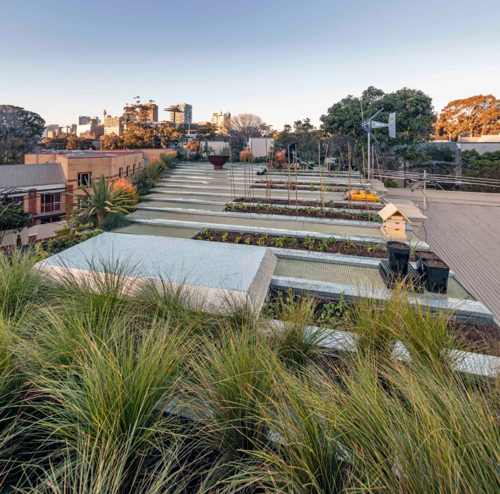 The rooftop is constructed of steel planter beds which provide deep soil for native plants and fruit and vegetables. The garden beds are irrigated with from the fishpond providing nutrient rich water created by the edible silver perch (fish).