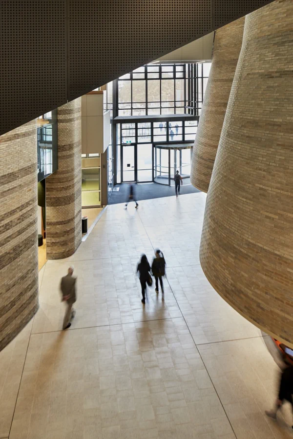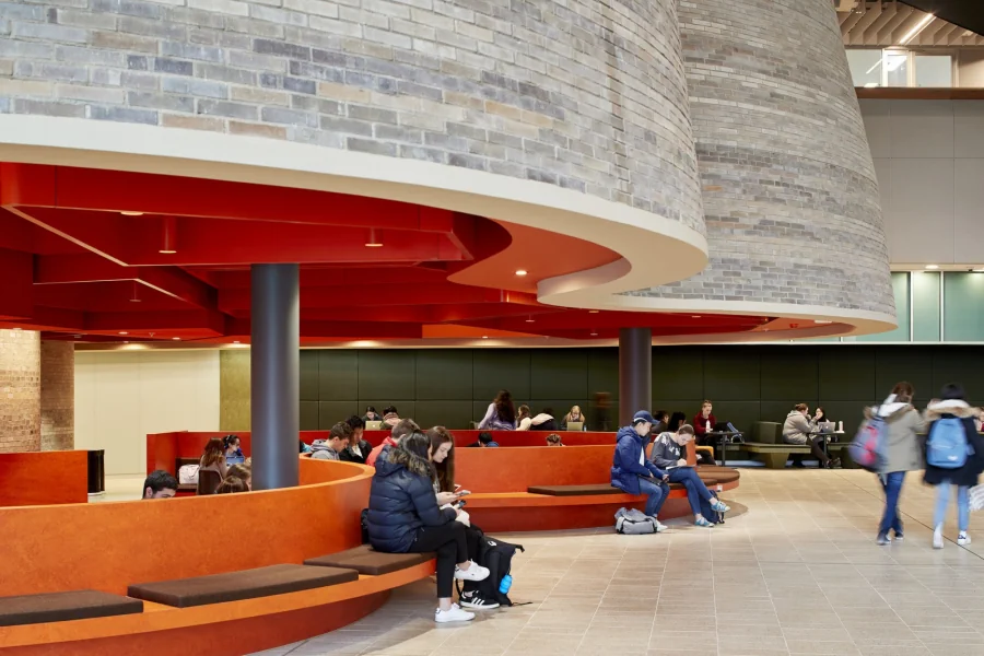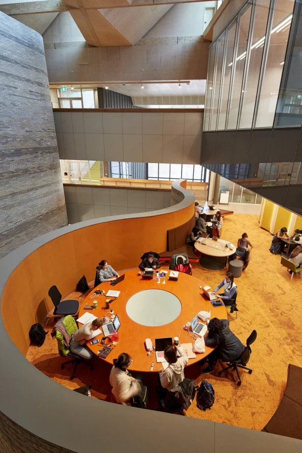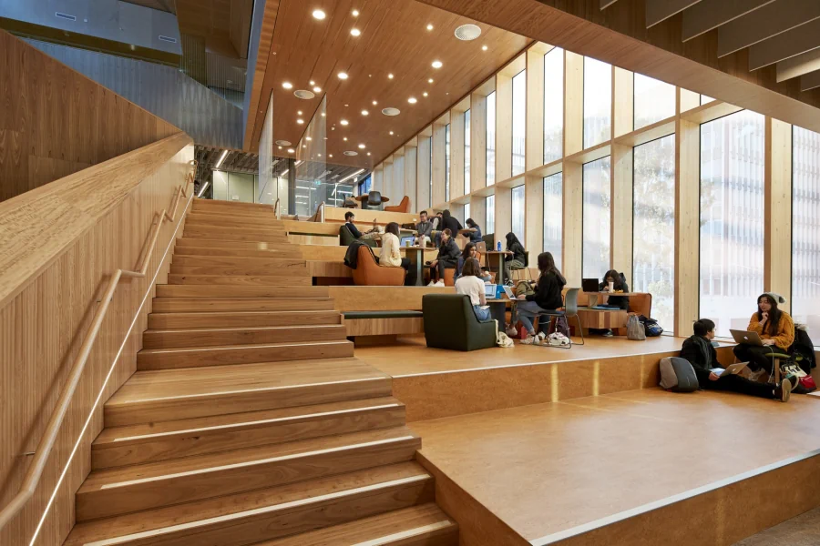 The learning activities of the interior are, in this way, made visible and accessible to the wider campus and community, rather than removed from the ground in a vertical structure.The LTB demonstrates a shift away from the modernist stand-alone tower instead incorporating a horizontal field of spaces set within a broad, low rise building.