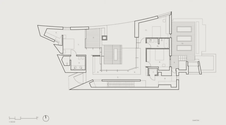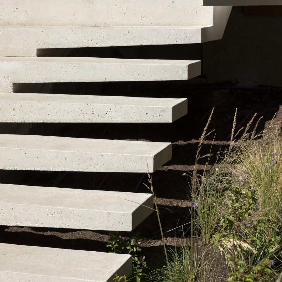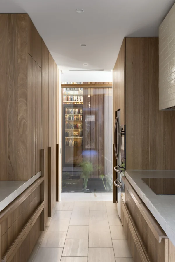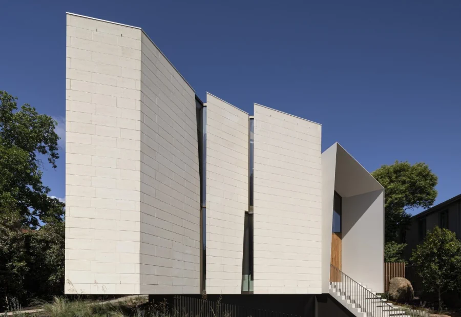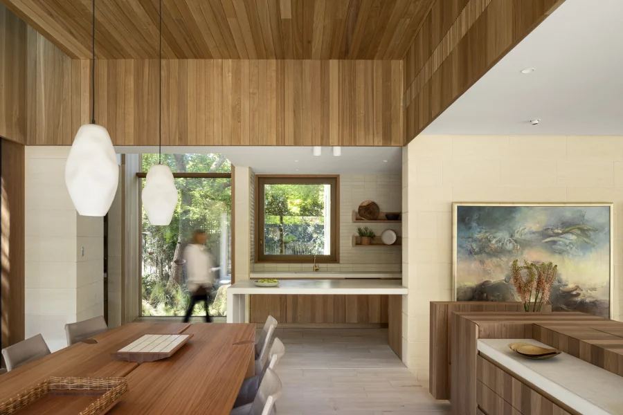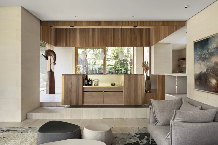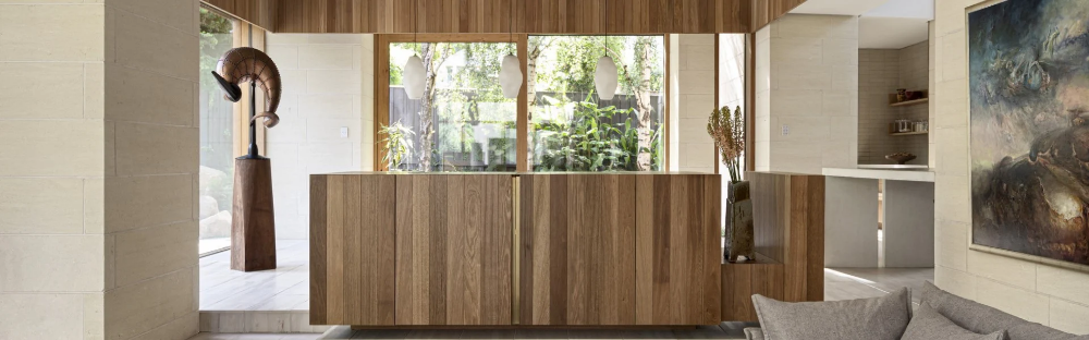 This energy efficient home wraps its occupants in a nurturing and healthy living environment. The envelope is robust and solid. Clad in Mt Gambier limestone, it will weather over time. The timber of the Dining room pavilion and study will similarly be allowed to weather to a silver grey. Natural materials which do not require long term maintenance. The street facing elevation is highly private but with enough windows cut into the stone surface to provide evidence of inhabitation. Additional openings are carved out of the stone surface of the north elevation. The largest is in front of a significant outdoor space which forms the centre of the house around which all other spaces are arranged.