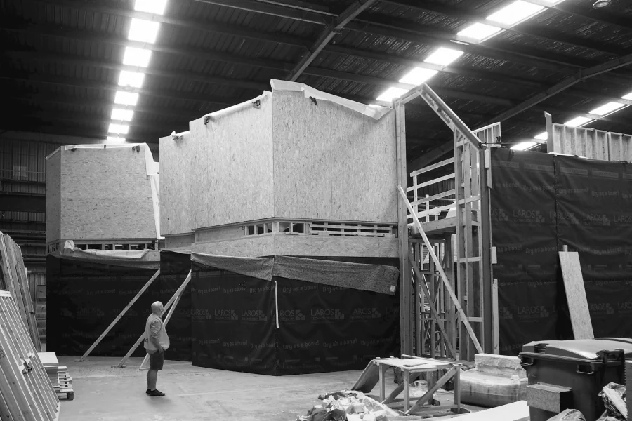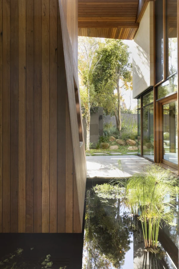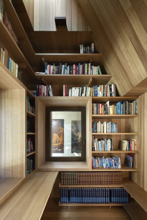 It provides north sun deep into the floor plan, allows for distant views and provides a strong connection to the garden. The setting for this two–storey space includes a planted pond within which floats a timber study. Two certifications were chosen to drive the environmental agenda of the project: Passivhaus and Living Building Challenge. A Passive house achieves a comfortable internal temperature using minimal energy input. This has been achieved by creating a very high performing and uninterrupted building envelope: Very high performing insulation and triple glazed windows has been used throughout. Air tightness and leakage are tested at three stages during the construction stage.