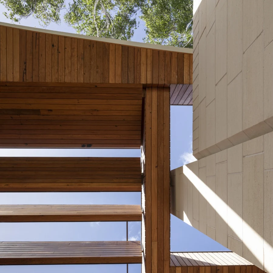 The Living Building Challenge is a green building certification program and sustainable building program that aims to achieve ideal environmental solutions for the built environment. The House will be self-sufficient in managing its water and waste water and has a photovoltaic cell system with battery storage to meet the house’s total energy needs. The materials used in the house, as much as possible are sourced from locations close to the site. Mt Gambier limestone cladding from South Australia, siltstone floor tiling from Queensland, recycled spotted gum and blackbutt timber flooring, cladding and interior linings from NSW and Queensland. All timber products are durable recycled Australian hardwoods.