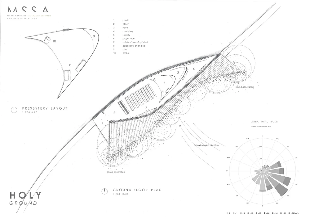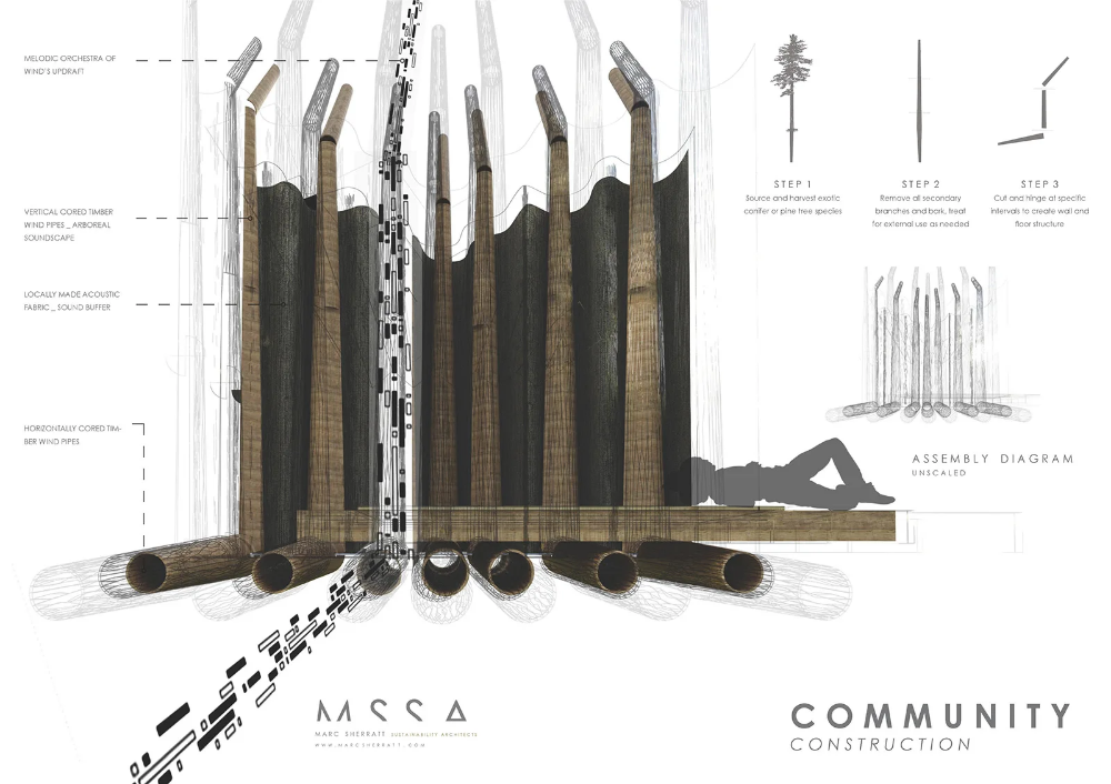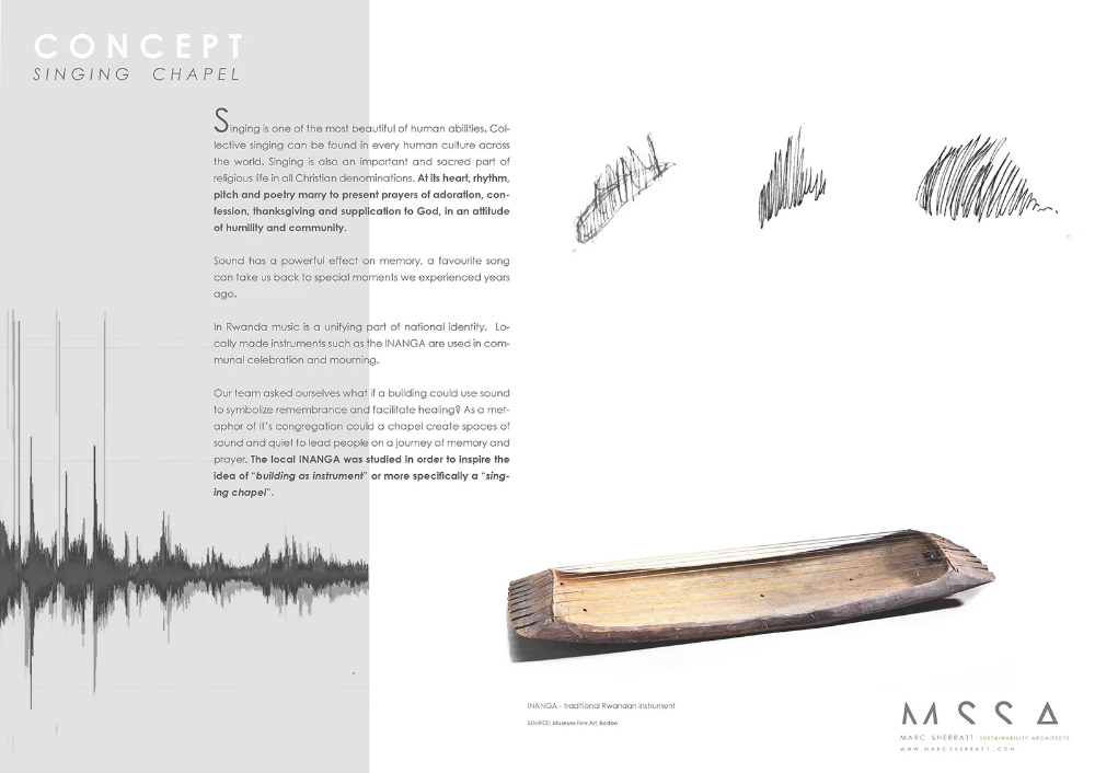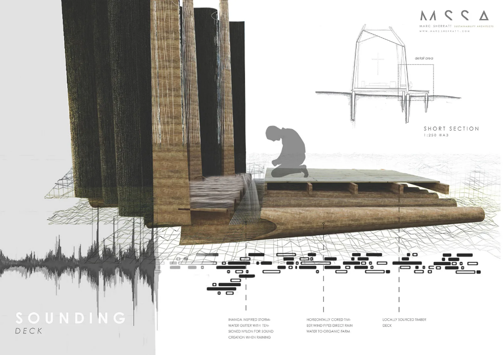 Our team asked ourselves what if a building could use sound to symbolize remembrance and facilitate healing? As a metaphor of it’s congregation could a chapel create spaces of sound and quiet to lead people on a journey of memory, praise and prayer. The INANGA was studied in order to inspire the idea of “building as instrument” or more specifically a “singing chapel”.