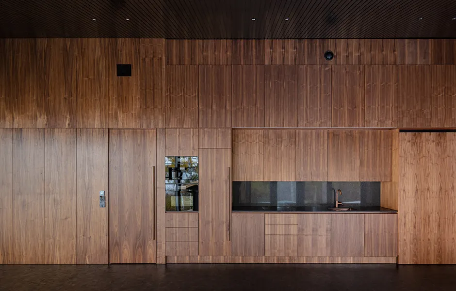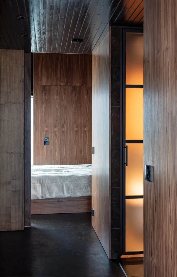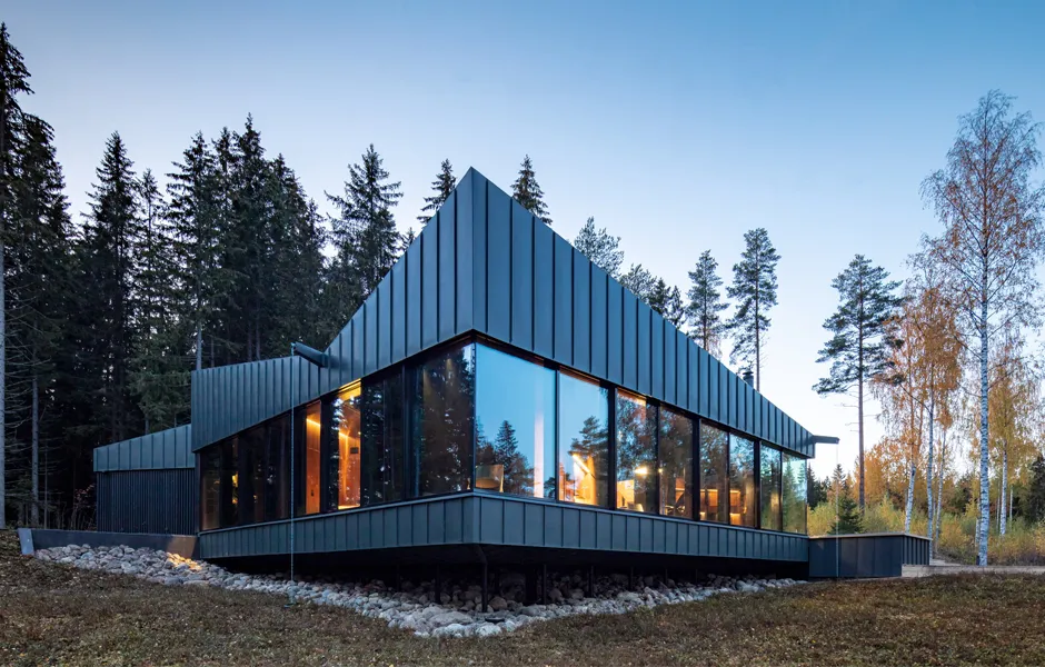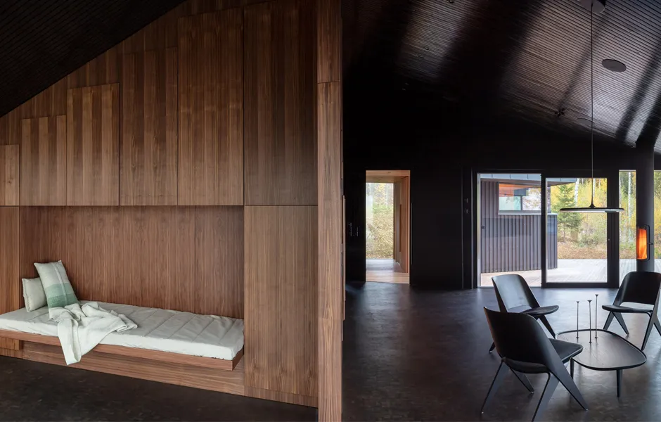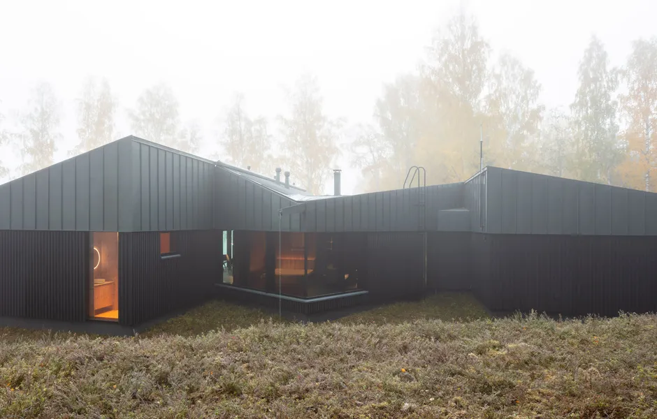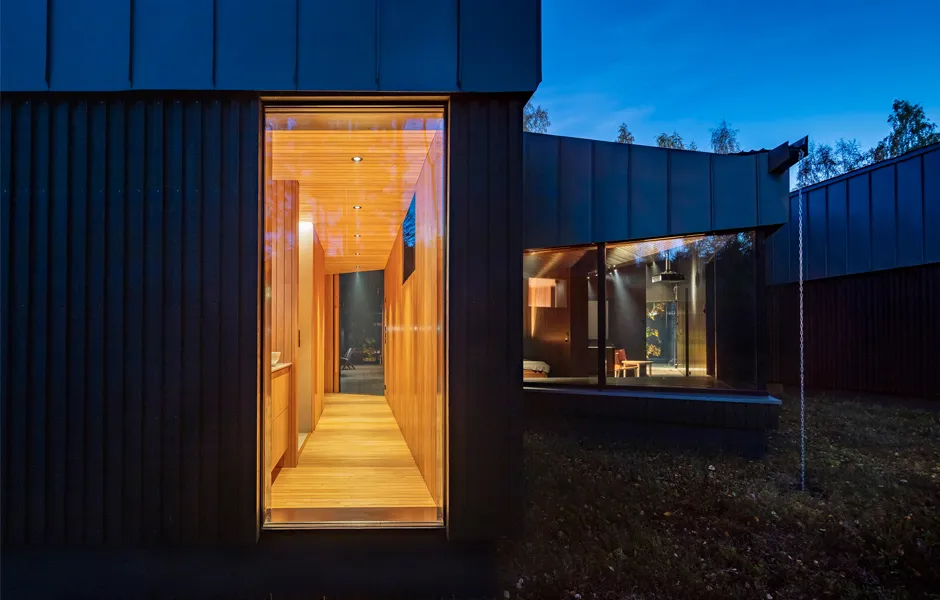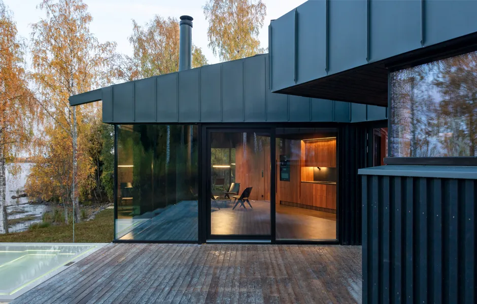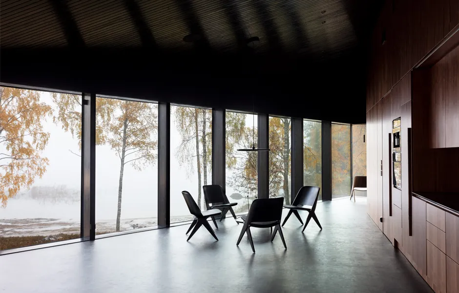 The exterior of the building is unambiguously distributed in terms of materials. The doors and windows are 2.3 meters high. Everything in this height all around the building is either glass or wood that has been oil painted black. All above and below this 2.3-meter-high zone is Rheinzink pre-patinated sheet zinc. The terraces and the stairs leading to the shore are made of larch. The interior material palette is also clear: the core, with all its surfaces and fixtures, is oiled walnut. Outside the core, the walls and ceilings, as well as the vertical structures, are black oil stained pine. The floor is made of black oil waxed oak parquet. The sauna and washrooms form a contrast to the dark main mass with paraffin-oiled alder on all surfaces. The shower has a ceramic tile that matches the wood.