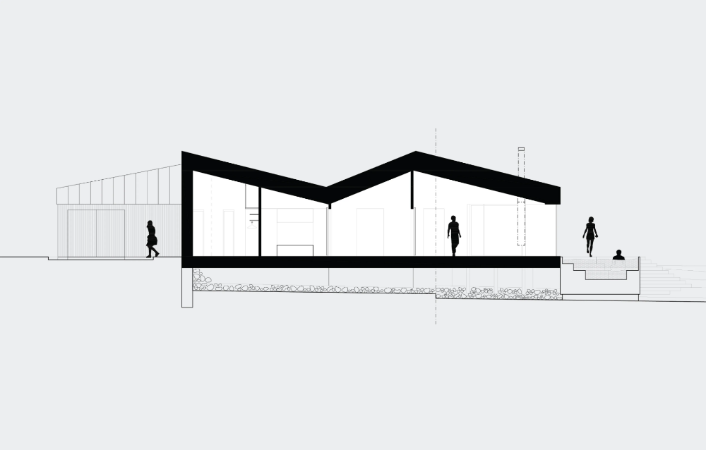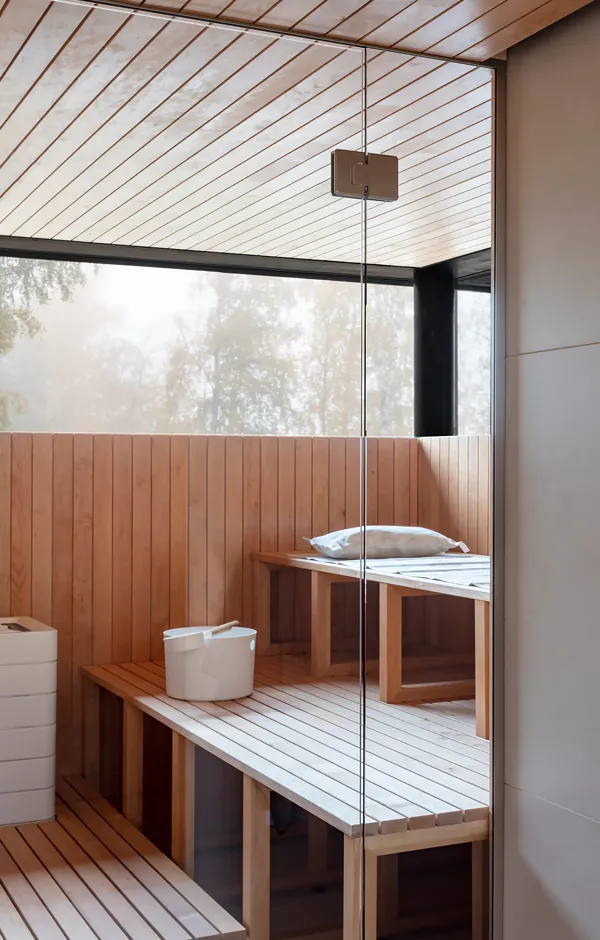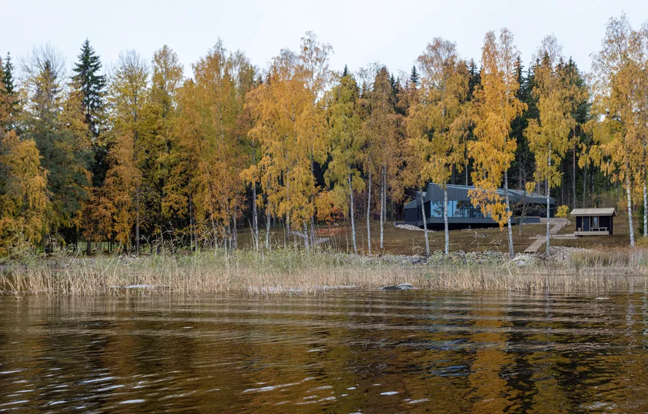 The building is approached from the south through a dense spruce forest, as the lake landscape slowly opens to the right on the east side. The spruce forest forms a natural and characteristic back wall for the construction site. It acts as a strong visual barrier along the western boundary of the plot, but also softens the place’s otherwise open sound landscape and adds a gentle, dark tone to it. At the beginning of the design, the plot was almost treeless and only one maple tree had to be removed to make room for the building. The rhythmic line of birches by the shore is an essential feature for the landscape opening from the interior of the house, and it also provides privacy when viewing the building from the lake. The steep stone embankment of the shore is repeated with the paving stones of the lower part of the house. The exact location of the building was largely determined by the views. The more north you move on the plot, the more the lake landscape opens, on the other hand the shortest distance to the shore was precisely determined. The old sauna by the shore had to be moved slightly in order to get the best view. Views have been sparingly opened towards the closest neighbor, located northwest, and towards the under-grown tree layer facing north, and the house is more enclosed in that direction. Instead of covering the large glass surfaces with interior curtains, a sun-blind was integrated into the outer surface of the wall structure, which does not allow heat radiation to enter, but allows views to the landscape to be enjoyed from inside the house.
