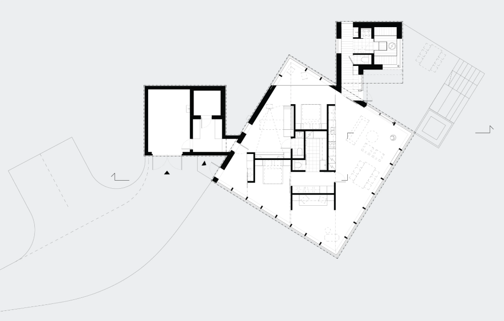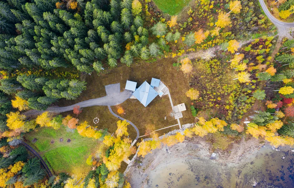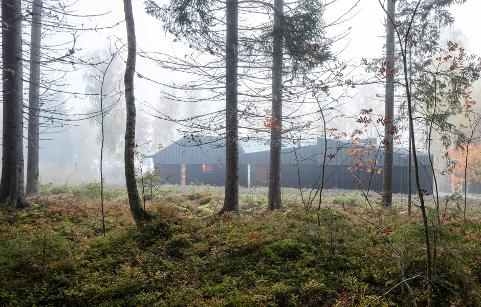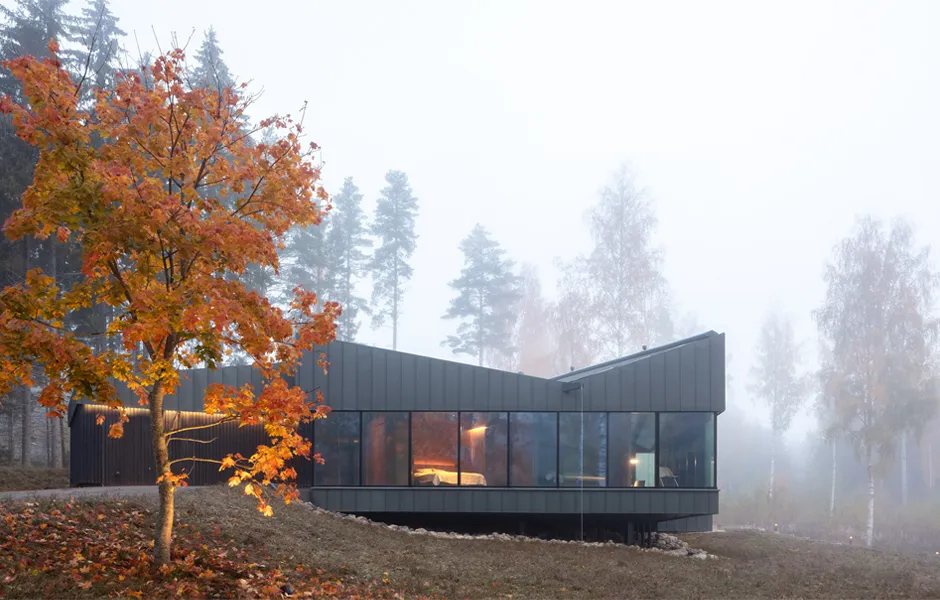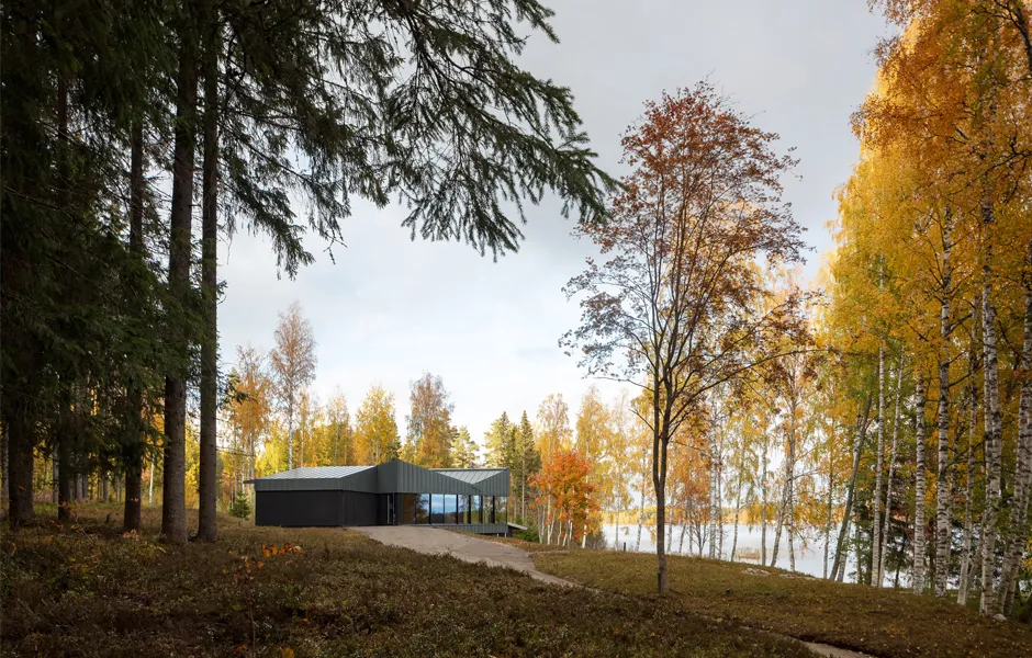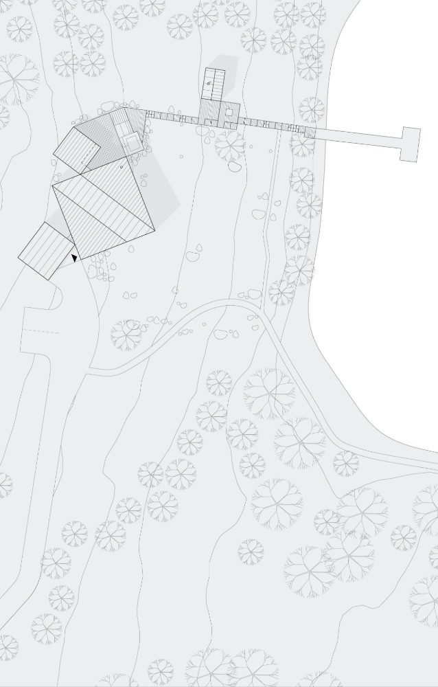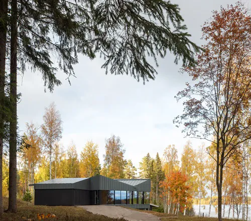 The building consists of three interlocking square masses. The locations of the spaces in different masses are strictly distributed according to the functions; the main mass contains the living, sleeping and dining areas, and the smaller ones have sauna and utility facilities, garage and technical facilities. The core of the main mass and the side masses are within the same coordinate system, which clarifies the connections between the spaces and calms the spatial experience. The basic idea behind the main mass is the core of the open square space, where all the fixtures are integrated and much of the functionality is located. The core has been shifted from the coordinate system of the main mass so that the use of the spaces between it and the outer walls could be optimized. The hallway, sleeping areas, entertainment corner and study are located in caverns created within this spatial distribution. Inside the core is a utility room, toilets and a walk-in closet. There is no traditional division into rooms, but spaces can be separated from one another by sliding doors if desired. The nature of the spaces varies greatly due to large glass surfaces and powerful openings to the landscape. The landscape itself is the most important element of the interior, which is alive and constantly changing according to the time of day and the seasons. On the lake side, the floor height of the building is clearly higher than the surrounding terrain to give the impression of floating above the lake. Similarly, the atmosphere of the spruce forest can be sensed in the living area, located in the western corner of the house, which has been raised to the height of the forest brush. This side is rooted in the ground, and less natural light seeps into the space so the experience is closer to that of the forest atmosphere.