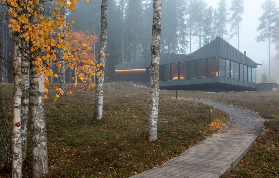 The special atmosphere of the spaces is largely due to the use of natural light and the different gloss levels of naturally treated wood surfaces. The design of the building’s spaces is not afraid of darkness but has turned it into a strength. The building has places with a huge amount of light and places where you can curl up into the shadows. Always according to the situation and mood. The principle of artificial lighting has been to illuminate only where necessary, bringing light to where you need it most and creating a safe and cozy atmosphere. The light is centered on the walnut core, which glows as a warm element when viewed from the outside. Outside, mainly the walkways are illuminated, but also a few trees as focal points in order to make it easier to see outside when it is dark.