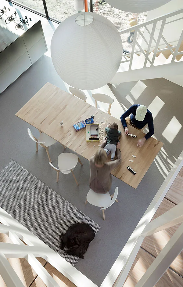 For the interior the goal was a diverse but clear layout. The knot responds to this by separating the house into three distinct wings that come together in the heart of the house: the double-height dining room. The wings offer privacy and seclusion, but company is never far away.