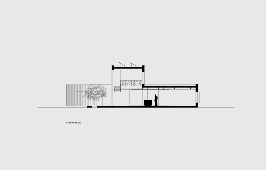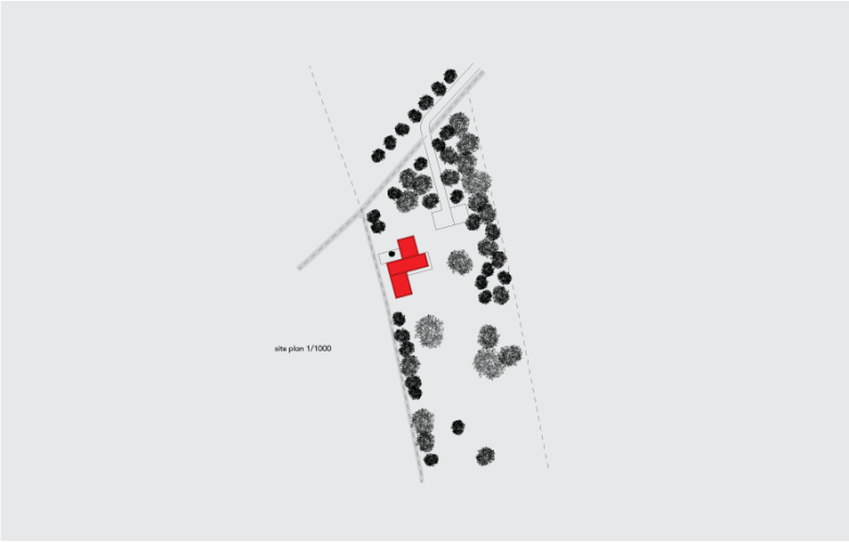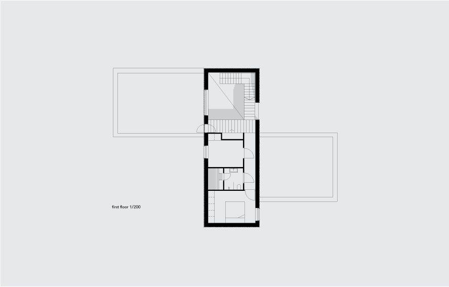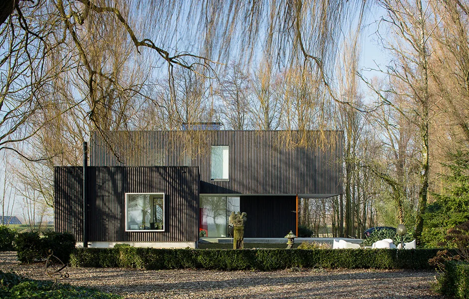 Local building regulations required the house to fit into the environment. By default that meant that the structure should be similar to the historical white plastered architecture of the neighboring houses. We opted instead to blend the house with the natural environment surrounding it. The dark, stained, vertical boards of larch make the building disappear against a backdrop of trees. The new house embraces the landscape and makes interaction with the surroundings its most important asset -both outdoors and inside.