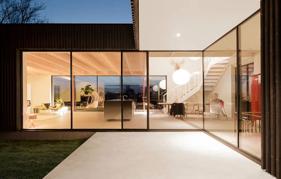 From the open living space the four main windows interact specifically with the landscape along each of the cardinal points. To the north a high window brings in the northern light. To the east a folded window embraces the enclosed garden. Towards the south a tube like window frames the view. To the west a huge window gives a panorama of the fields and the evening sun.