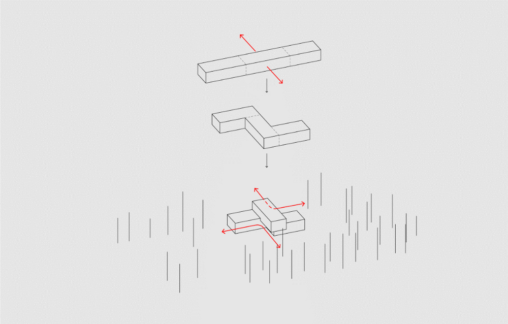 All that was left was the location and a few retaining walls. The clients decided against a replica of the original farmstead. Instead, they aspired for a contemporary, square-tube house where all the functions would be organized along a linear sequence. The tube developed into a knot, which engages better with the surrounding landscape by extending in every cardinal direction.