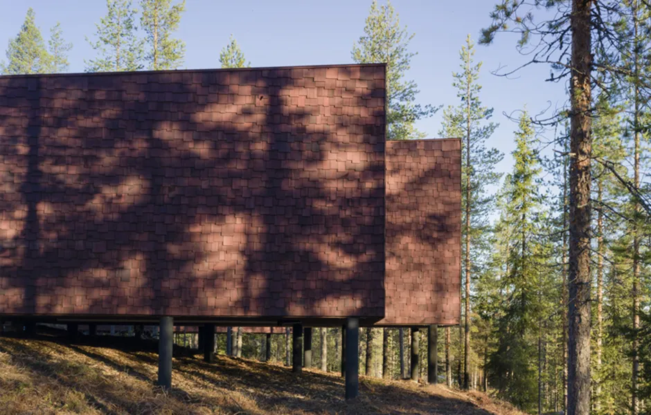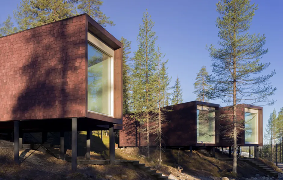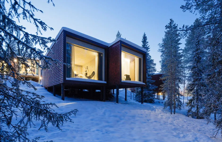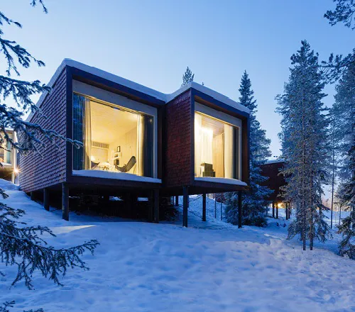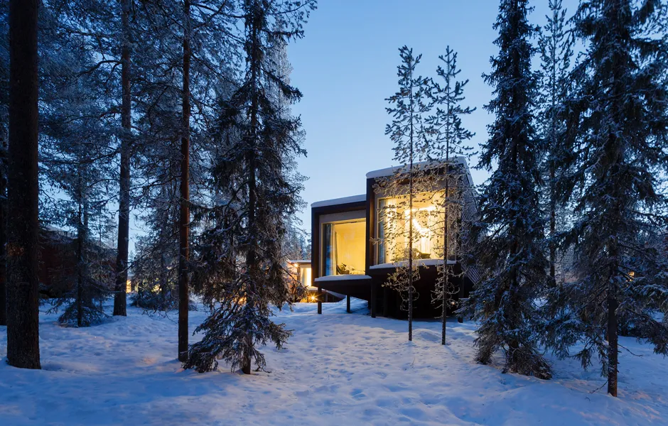 The Arctic TreeHouse Hotel project started with a concept design made in close cooperation with the client. The inspiration for the accommodation concept — set on a steep natural slope — came from Nordic nature and culture as well as the magical world of SantaPark. A vision started to form: small individual accommodation buildings set in nature, their spirit highlighting characteristics of the area and creating an optimal setting for experiencing both nature and arctic mysticism.