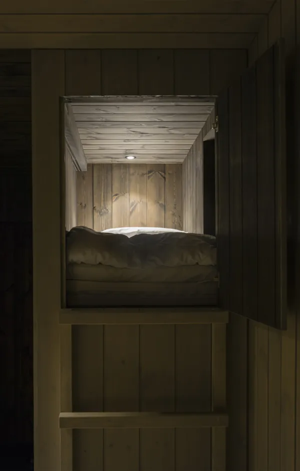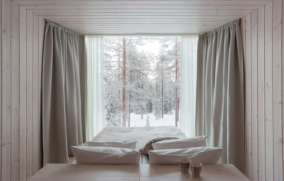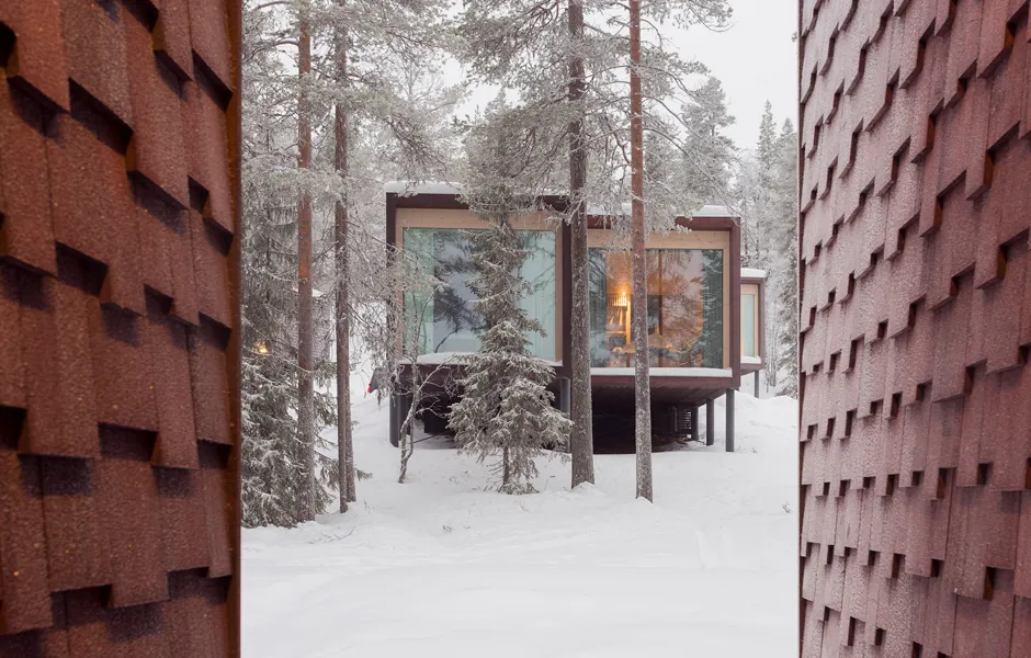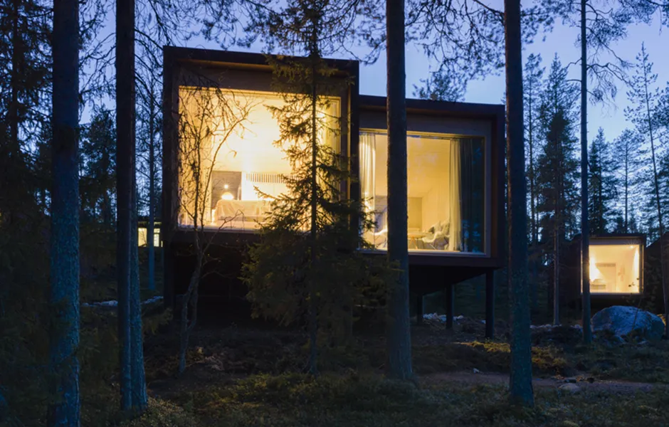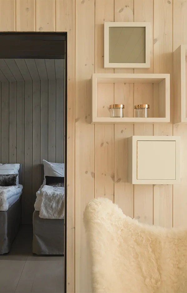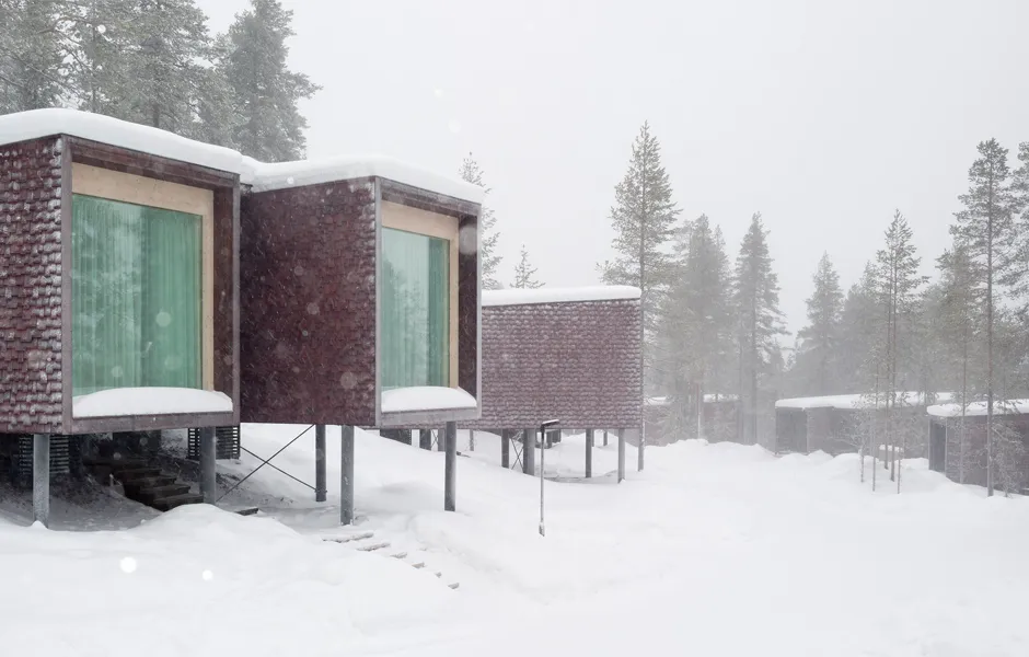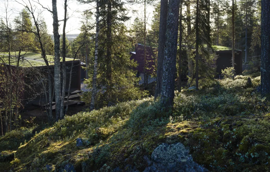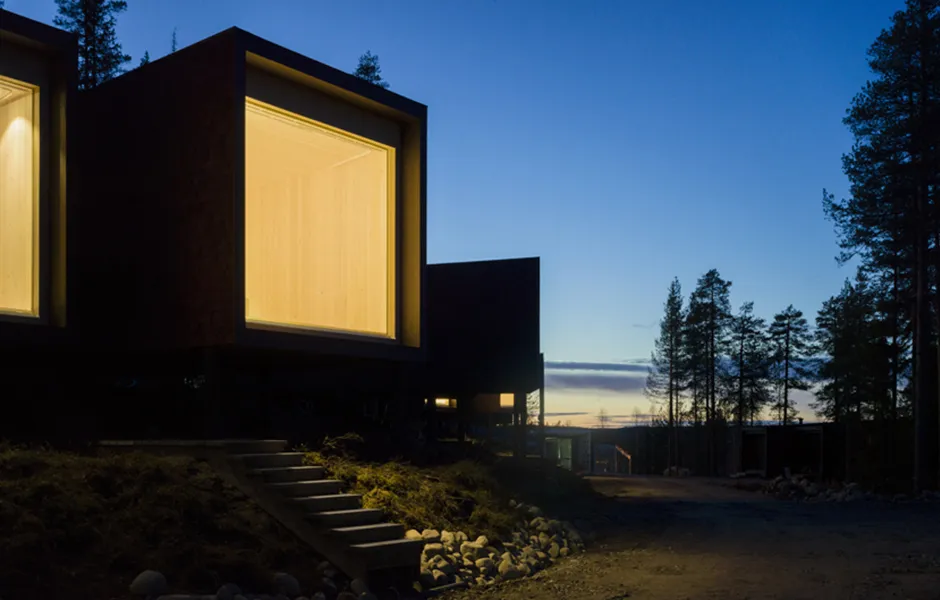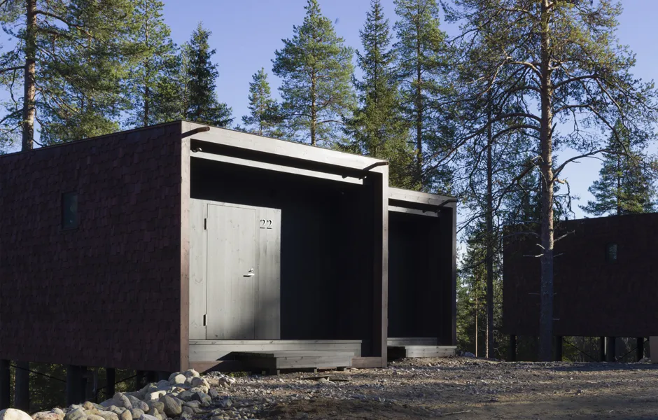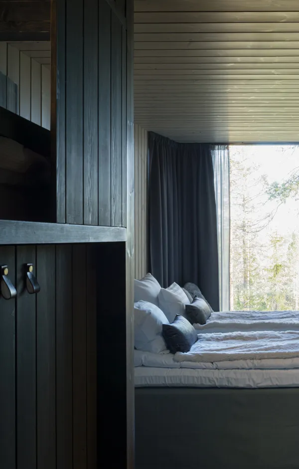 Light pollution outdoors has been kept to a minimum due to the northern lights and to enable a true wilderness experience. There are just enough lights for safe accessibility and to help you find your own sleeping place. Some beautiful, deliberately chosen trees have been lit to act as reference points. During evenings and nights the buildings glow on the terrain like lanterns, casting interesting shadows and inviting you to step into the warm indoors. During the day, the play between light and shadow on the interior and exterior surfaces enters the buildings into a delicate discussion with the surrounding nature and its materials.
