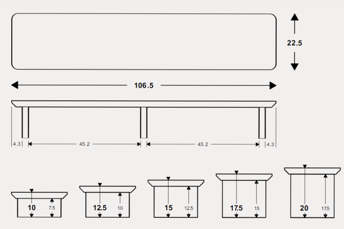 The Extra-Wide Desk Shelf is 106.5cm wide and 22.5cm deep (front to back) making it the perfect size for a large dual monitor setup.