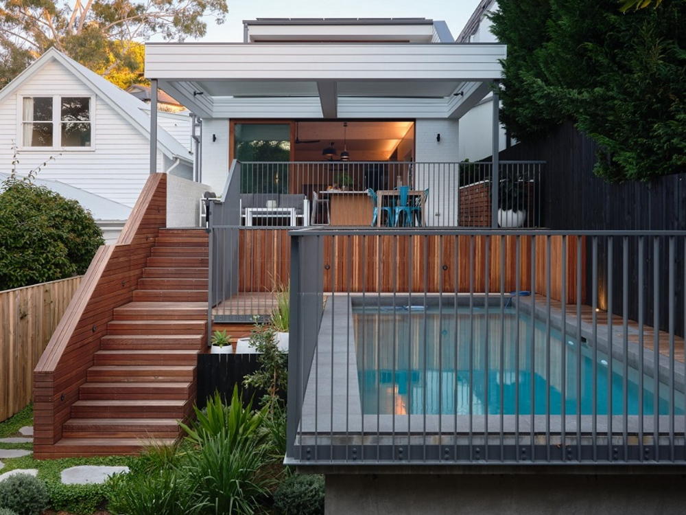 The entry of the home was reconfigured so that you enter the house at street-level, via a green roof. This arrival sequence establishes the biophilic connection to the garden and gully that continues throughout the house. The primary bedrooms and private spaces have been retained but reinvigorated with updated glazing, skylights, and an insulated high-performance envelope. The communal spaces of the house have been reconfigured to provide more generous proportions with fluid connections to the garden. The garden has been designed in collaboration with Melissa Wilson Landscape Architect with a generous outdoor dining area and swimming pool.