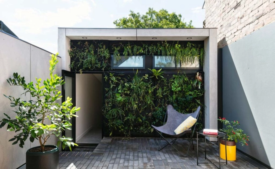 With a span of 3.8 metres at its widest point, the Ferry Road House optimises the available site area within its mid-terrace location, stepping with the existing topography of the site and capturing northern light and views to the sky, canopies of nearby trees. Accompanied by a modest detached garage with first floor studio, the Ferry Road House features a light-filled central courtyard with green wall, providing a sunny and green outlook from the living room and the kitchen.