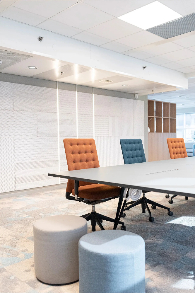 As part of the renovation of the existing building, Fremtind adopted a new activity based method of working. Throughout the building there are many open areas, which makes work easy and transparent. In these types of open spaces however, clusters of conversation can create background noise, which can easily distract workers. To reduce sound reflections, BAUX Pulp has been used extensively in common areas and meeting spaces. As well as being 100% sustainable, BAUX Pulp effectively absorbs sound reflections in the human voice spectrum, to create a beautifully harmonious workspace.