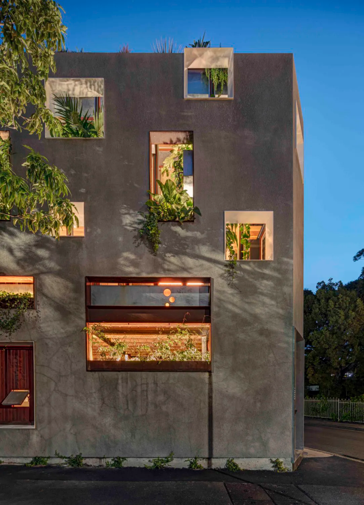 Built within a rejuvenated heritage façade of rendered masonry, steel, timber and greenery, the Welcome to the Jungle House is situated in an inner-city heritage conservation area typified by late Victorian row terrace housing and post-industrial warehouse conversions. A two-storey shop top house in disrepair and close to collapse originally occupied the 90sqm triangular site. The original spackled rendered masonry façade had cultural and streetscape significance to the local heritage conservation area and its necessary reconstruction was managed under strict heritage controls. Original window openings have been framed in pre-rusted steel and juxtaposed with new openings framed in gloss white powder coat steel. A black photovoltaic panel array signals the new addition to the original northern façade, harnessing sunlight throughout the day, acting as a billboard for the sustainability attributes of the architecture and starkly contrasting the original rendered heritage facade.