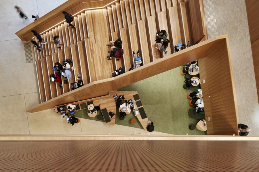 The learning activities of the interior are, in this way, made visible and accessible to the wider campus and community, rather than removed from the ground in a vertical structure.The LTB demonstrates a shift away from the modernist stand-alone tower instead incorporating a horizontal field of spaces set within a broad, low rise building.