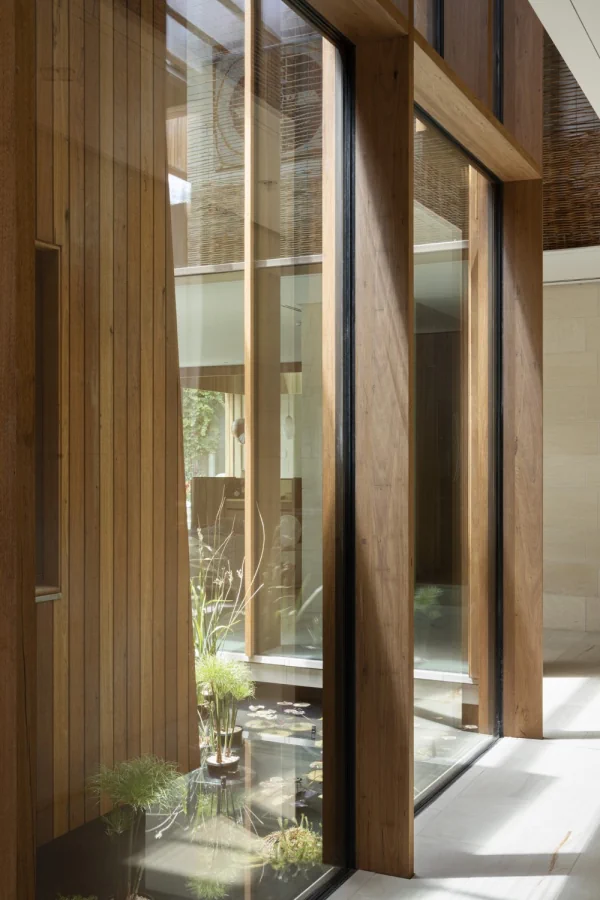 It provides north sun deep into the floor plan, allows for distant views and provides a strong connection to the garden. The setting for this two–storey space includes a planted pond within which floats a timber study. Two certifications were chosen to drive the environmental agenda of the project: Passivhaus and Living Building Challenge. A Passive house achieves a comfortable internal temperature using minimal energy input. This has been achieved by creating a very high performing and uninterrupted building envelope: Very high performing insulation and triple glazed windows has been used throughout. Air tightness and leakage are tested at three stages during the construction stage.
