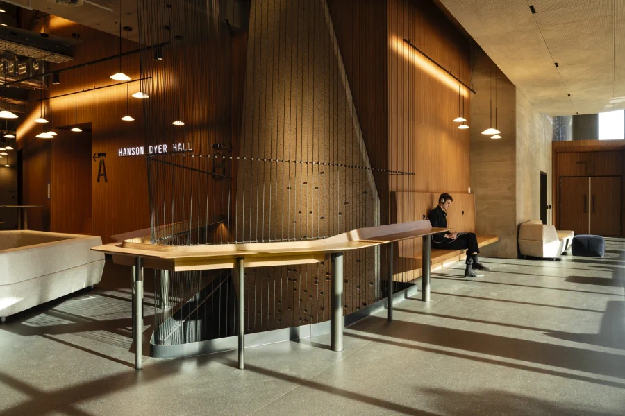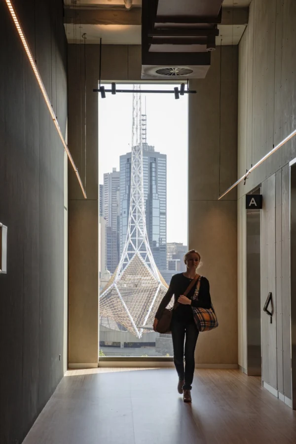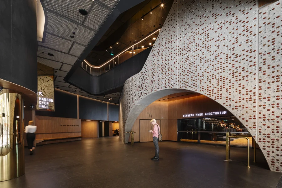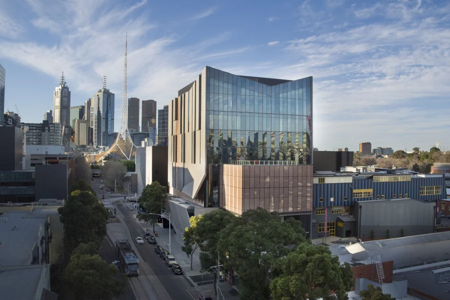 The new home of the Melbourne Conservatorium of Music celebrates the activities of music rehearsal and practice – a green room for Melbourne's arts precinct. Outwardly focused and inviting, the building balances the singular concentration required of students with the camaraderie of engaging with others. The building is a place to rub shoulders with fellow music students, and the artistic milieu of the wider campus and precinct.