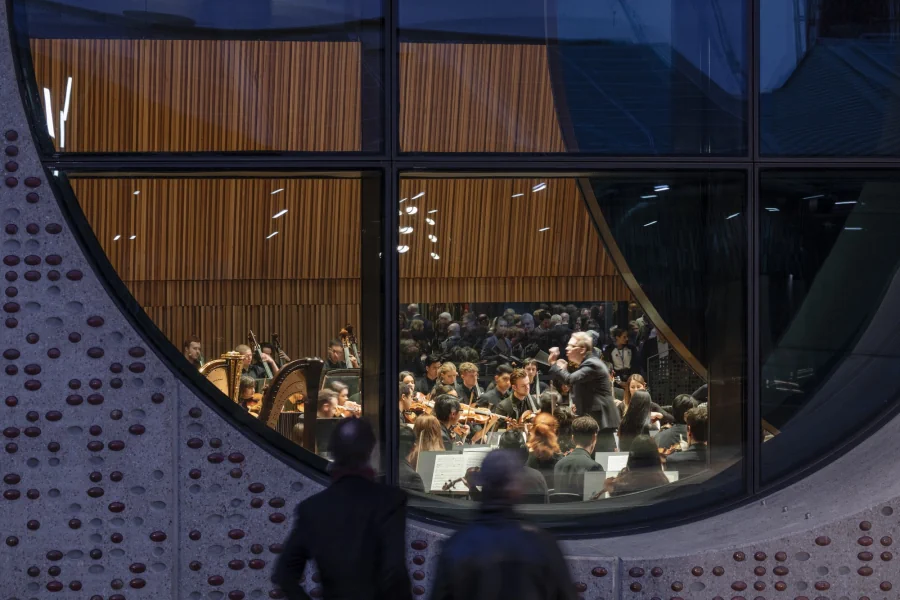 Numerous vantage points in the conservatorium allow for appreciating the inner workings of music teaching. The learning and rehearsal spaces are interspersed with bell-shaped portholes, hinged panels and disguised windows that generously exhibit the activity within. The largest of these apertures is the oculus window located on the ground floor into the orchestral rehearsal space, which offers passers-by a glimpse into the inner realm of music education.