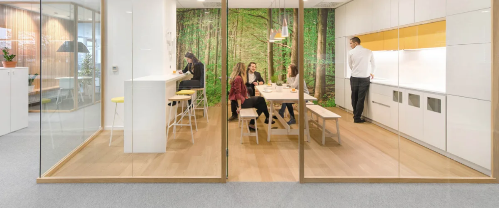 A lot of attention was paid to the functionality and ambiance of the common areas and meeting rooms which are now bright, spacious and made of natural materials. We put particular emphasis on wooden elements which serve both as a decoration and an acoustic lining inside individual booths.