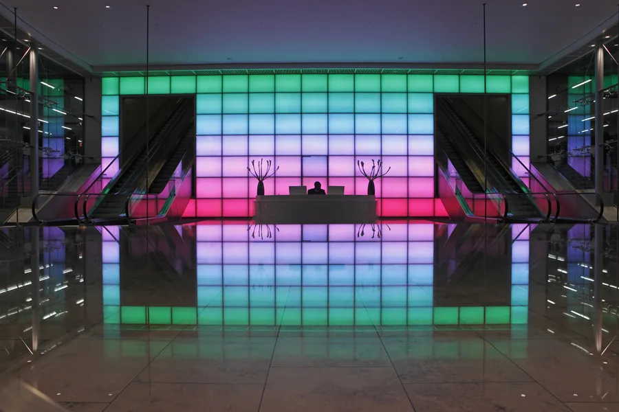 Through backlighting one cannot only make an exciting design object but also use colour RGB LEDs to generate colour palettes, as Glaskeramik is a very even light diffuser. Sometimes with a lightbox 5-10 cm depth of construction or simple LED arrays or LED strips directly on the material or using LED light sheets (such as Polylite) where depths are minimal, areas of even diffusion are large.