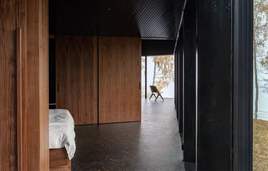 The exterior of the building is unambiguously distributed in terms of materials. The doors and windows are 2.3 meters high. Everything in this height all around the building is either glass or wood that has been oil painted black. All above and below this 2.3-meter-high zone is Rheinzink pre-patinated sheet zinc. The terraces and the stairs leading to the shore are made of larch. The interior material palette is also clear: the core, with all its surfaces and fixtures, is oiled walnut. Outside the core, the walls and ceilings, as well as the vertical structures, are black oil stained pine. The floor is made of black oil waxed oak parquet. The sauna and washrooms form a contrast to the dark main mass with paraffin-oiled alder on all surfaces. The shower has a ceramic tile that matches the wood.