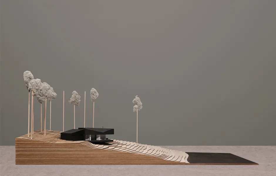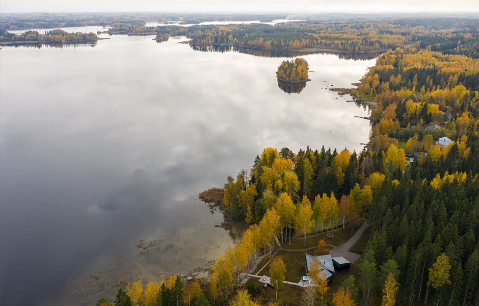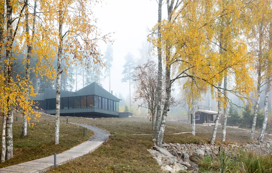 The building consists of three interlocking square masses. The locations of the spaces in different masses are strictly distributed according to the functions; the main mass contains the living, sleeping and dining areas, and the smaller ones have sauna and utility facilities, garage and technical facilities. The core of the main mass and the side masses are within the same coordinate system, which clarifies the connections between the spaces and calms the spatial experience. The basic idea behind the main mass is the core of the open square space, where all the fixtures are integrated and much of the functionality is located. The core has been shifted from the coordinate system of the main mass so that the use of the spaces between it and the outer walls could be optimized. The hallway, sleeping areas, entertainment corner and study are located in caverns created within this spatial distribution. Inside the core is a utility room, toilets and a walk-in closet. There is no traditional division into rooms, but spaces can be separated from one another by sliding doors if desired. The nature of the spaces varies greatly due to large glass surfaces and powerful openings to the landscape. The landscape itself is the most important element of the interior, which is alive and constantly changing according to the time of day and the seasons. On the lake side, the floor height of the building is clearly higher than the surrounding terrain to give the impression of floating above the lake. Similarly, the atmosphere of the spruce forest can be sensed in the living area, located in the western corner of the house, which has been raised to the height of the forest brush. This side is rooted in the ground, and less natural light seeps into the space so the experience is closer to that of the forest atmosphere.