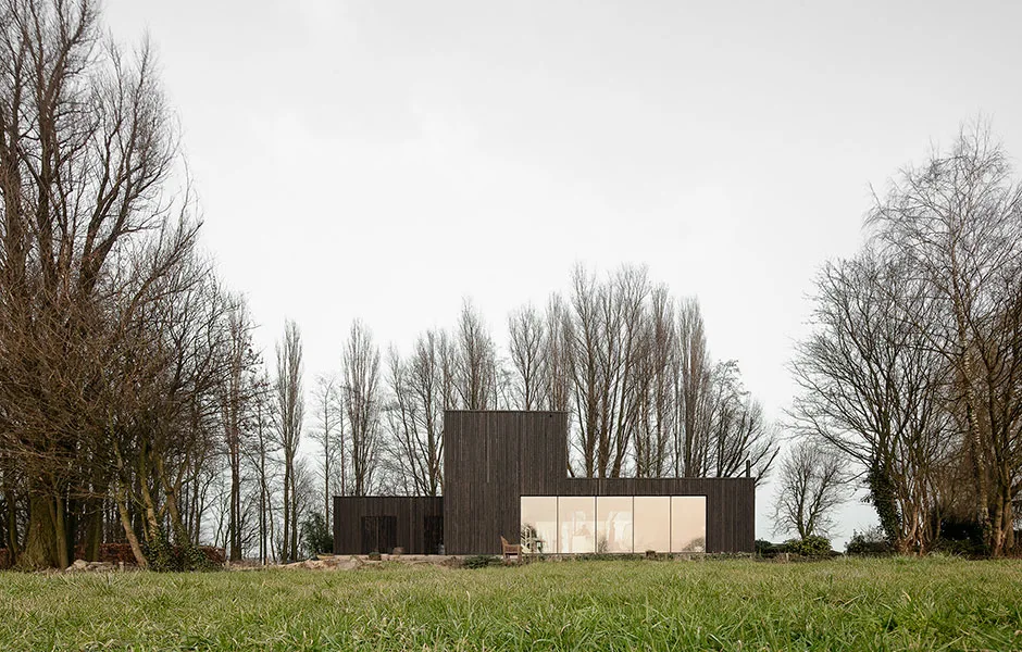 Local building regulations required the house to fit into the environment. By default that meant that the structure should be similar to the historical white plastered architecture of the neighboring houses. We opted instead to blend the house with the natural environment surrounding it. The dark, stained, vertical boards of larch make the building disappear against a backdrop of trees. The new house embraces the landscape and makes interaction with the surroundings its most important asset -both outdoors and inside.